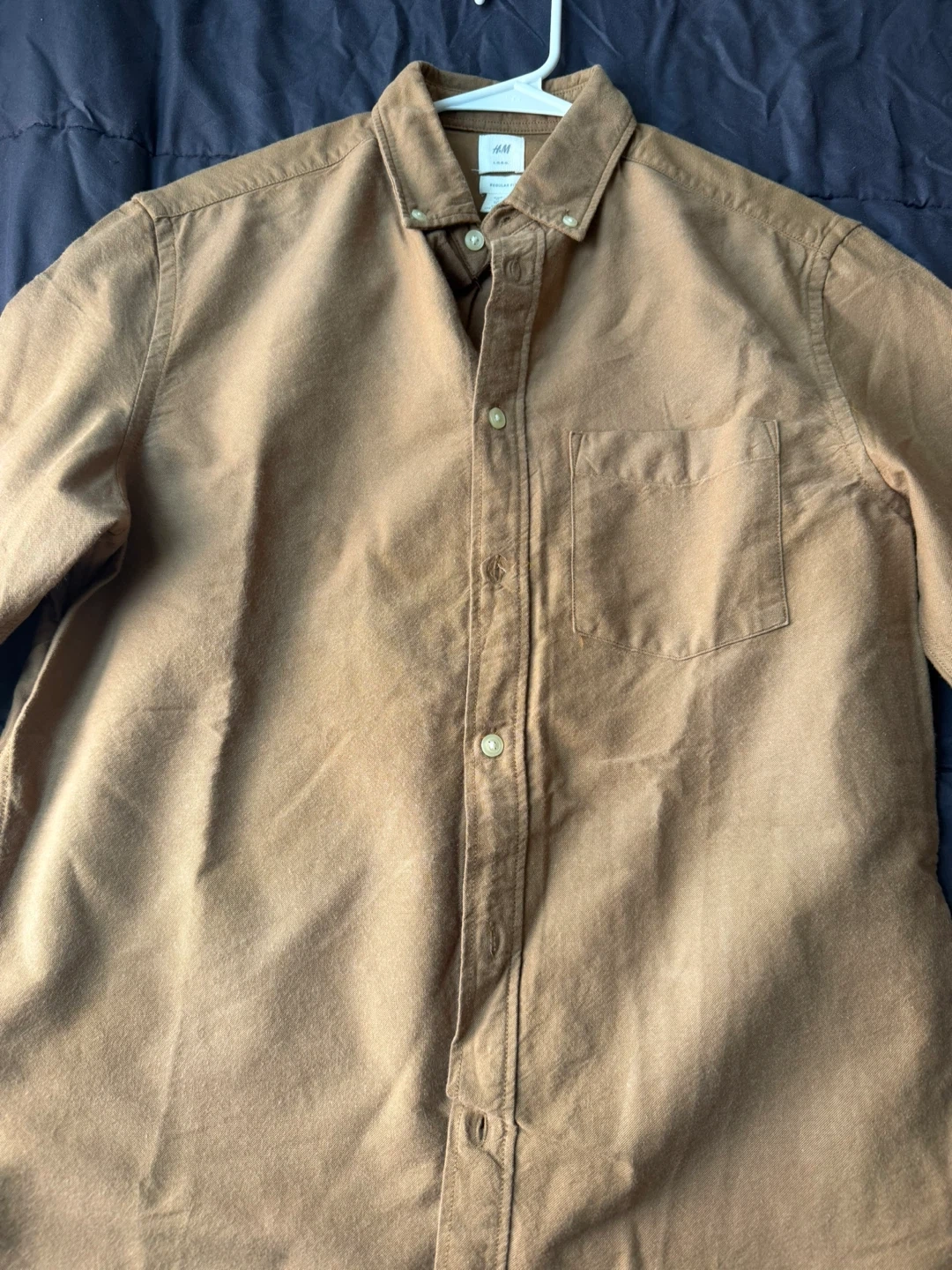 A classic brown long-sleeved button-up shirt from H&M. It's a regular fit with a chest pocket and button closure. Made from a comfortable cotton blend. Never used. New.