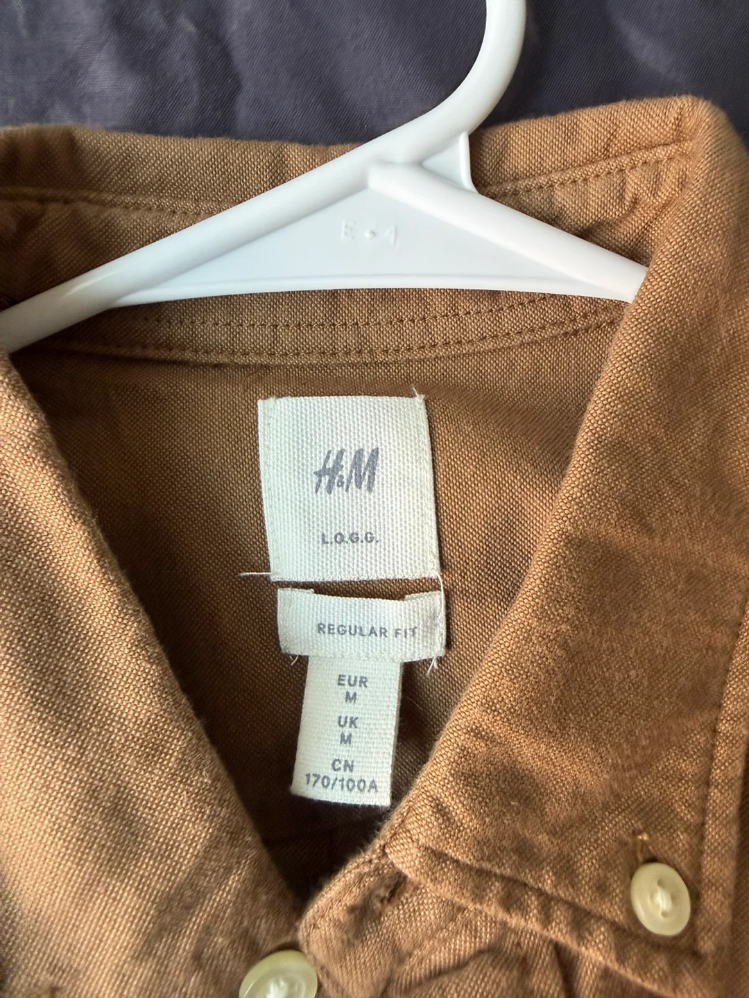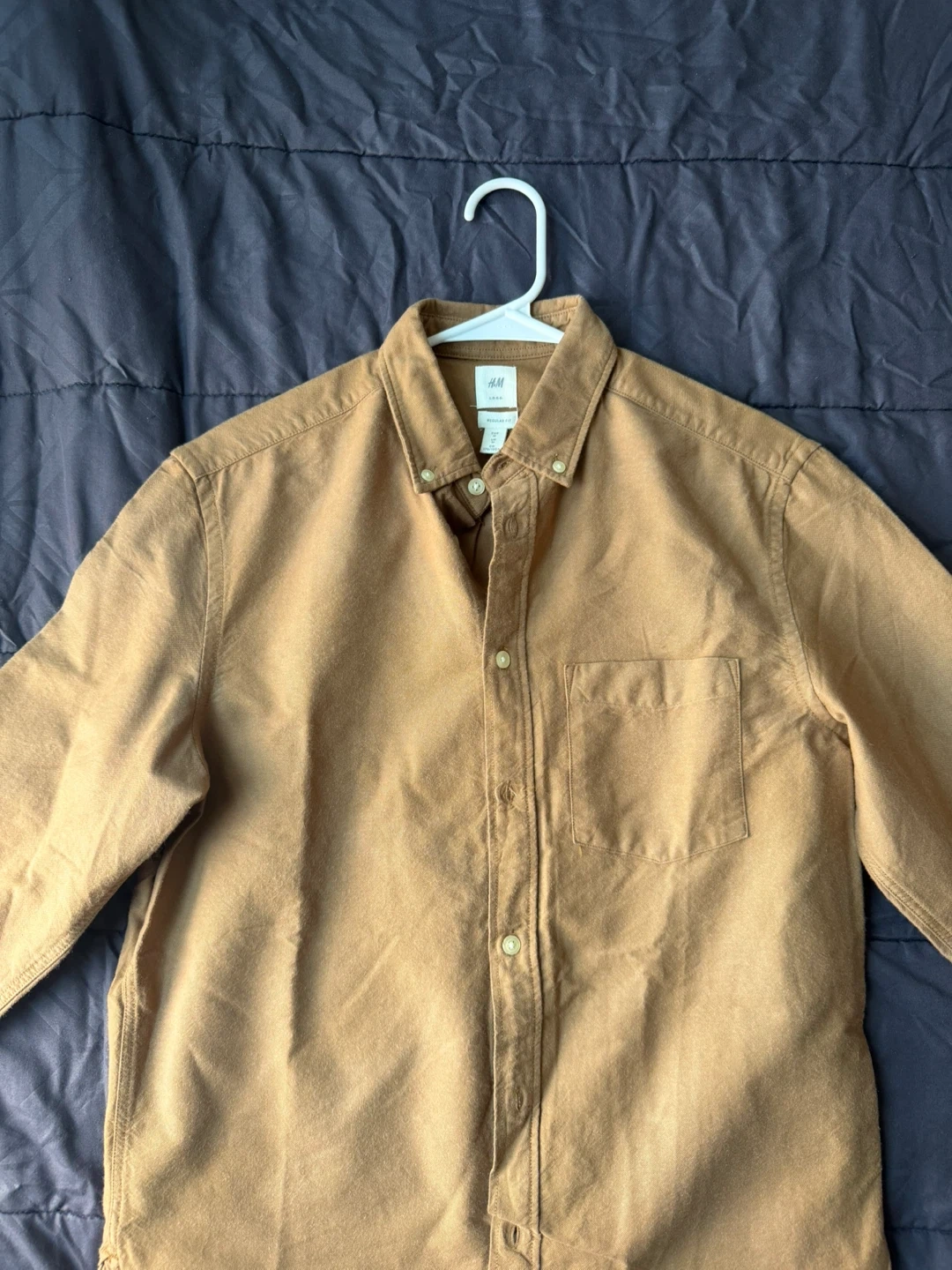 A classic brown long-sleeved button-up shirt from H&M. It's a regular fit with a chest pocket and button closure. Made from a comfortable cotton blend. Never used. New.