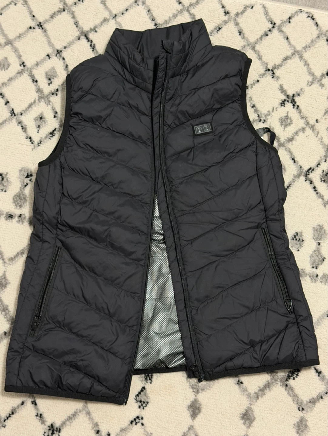 This black heated vest offers adjustable warmth. It's made with a quilted outer shell and has zippered pockets. The inner lining has instructions for use and care.