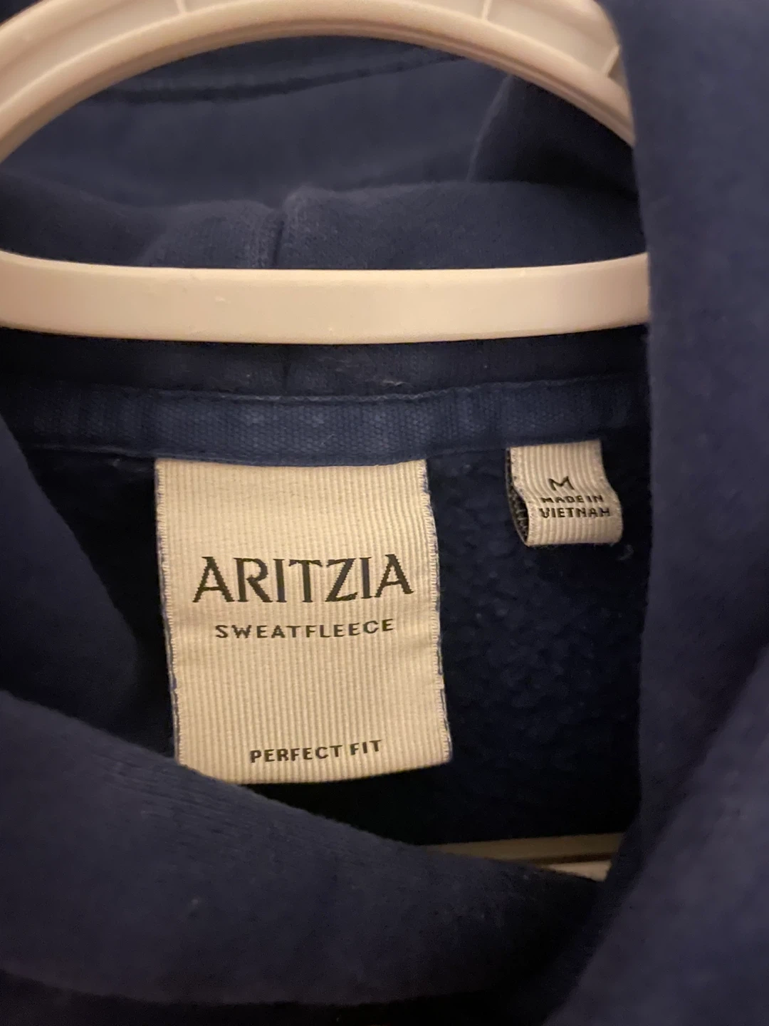 Aritzia navy blue hoodie made from sweatfleece material. It's a size medium and offers a perfect fit. This pullover style is great for casual wear.