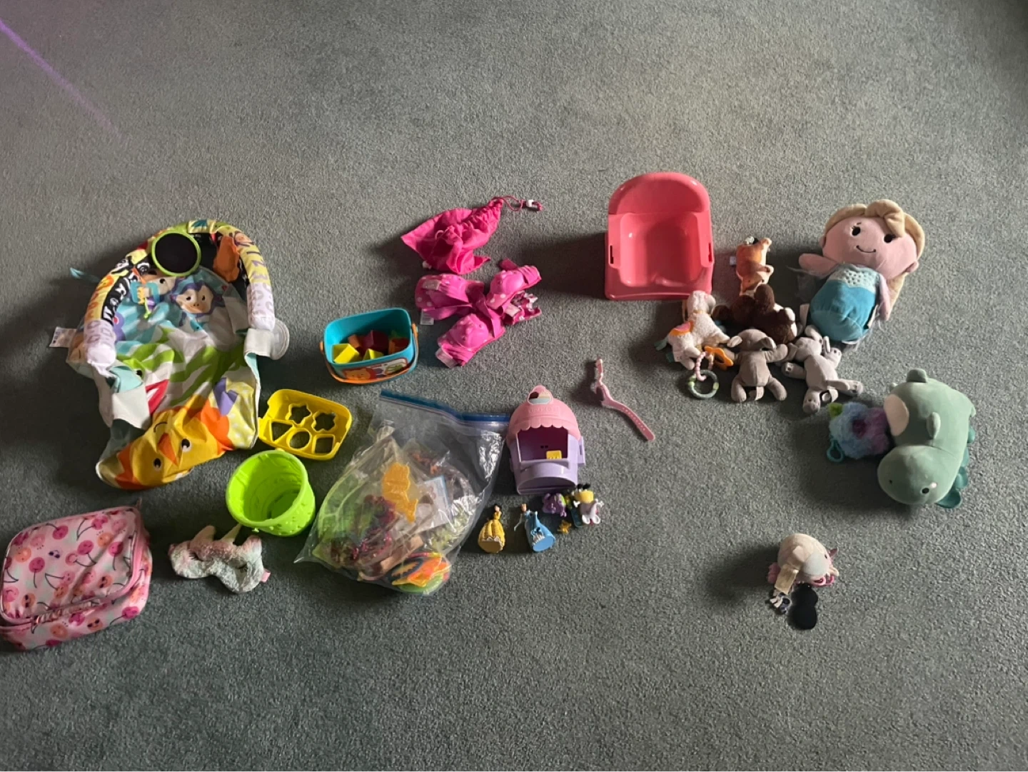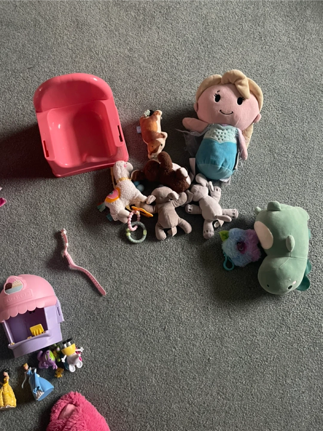 A collection of assorted toddler toys including plush animals, building blocks, and figures. These toys are great for imaginative play and development.