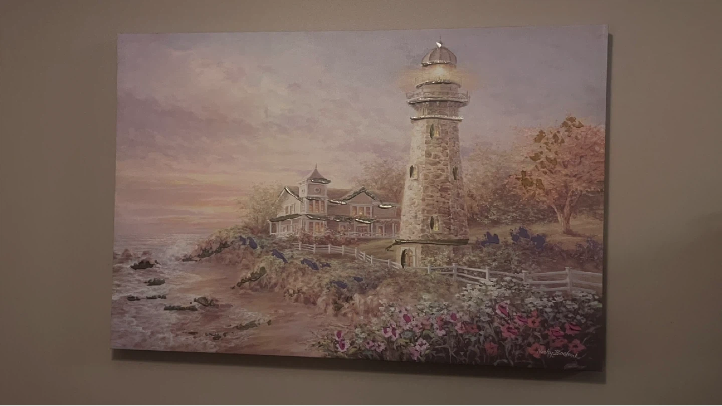 A beautiful canvas print featuring a coastal lighthouse and a house. The artwork depicts a serene seaside scene with crashing waves and a colorful floral foreground. It's ready to add a touch of charm to your home decor!