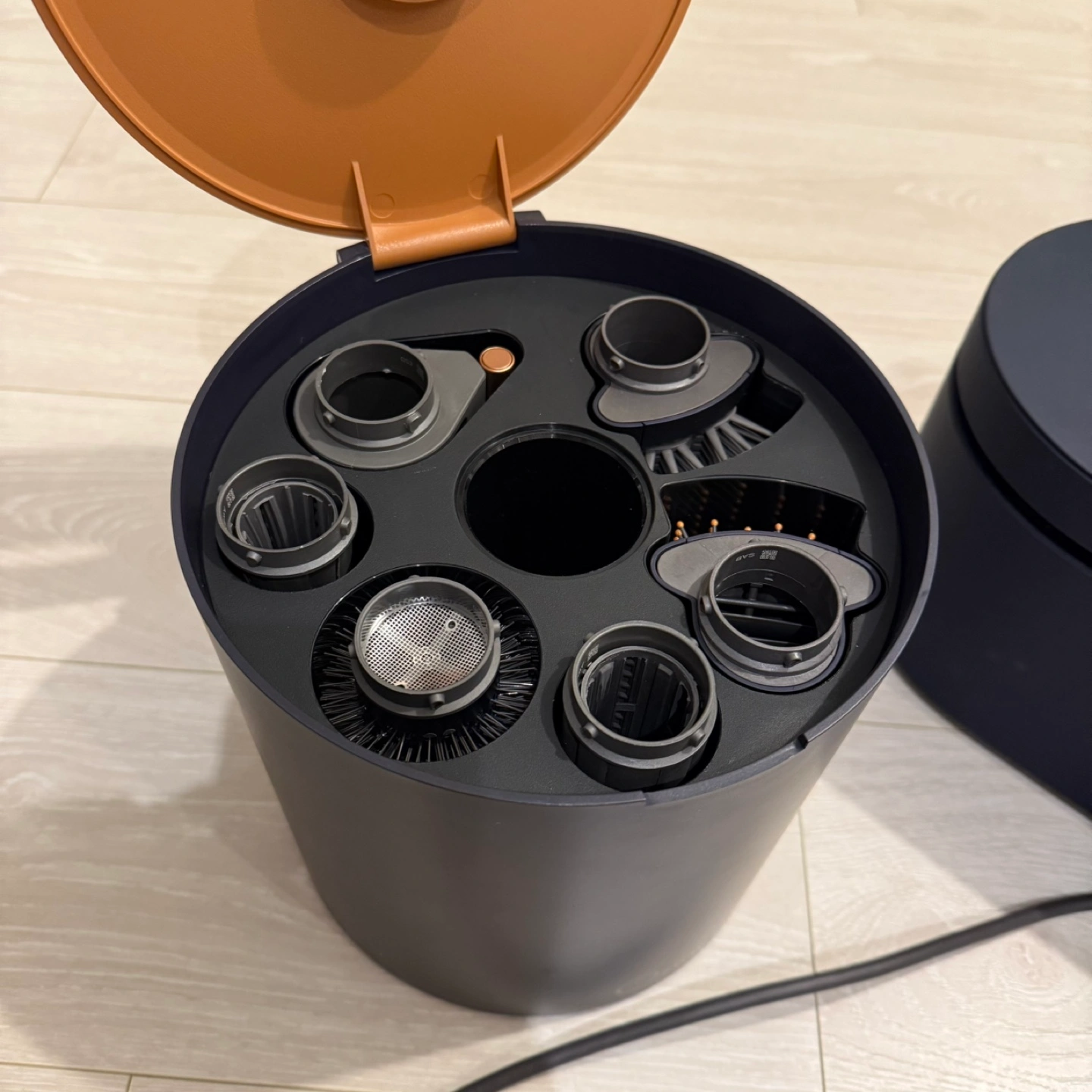 61Dyson Airwrap Compelete long. Use only 2 times. tools are new. Includes a copper-topped storage container with compartments for various attachments and a separate storage container for the hair dryer. Keeps everything organized and protected. pick up only