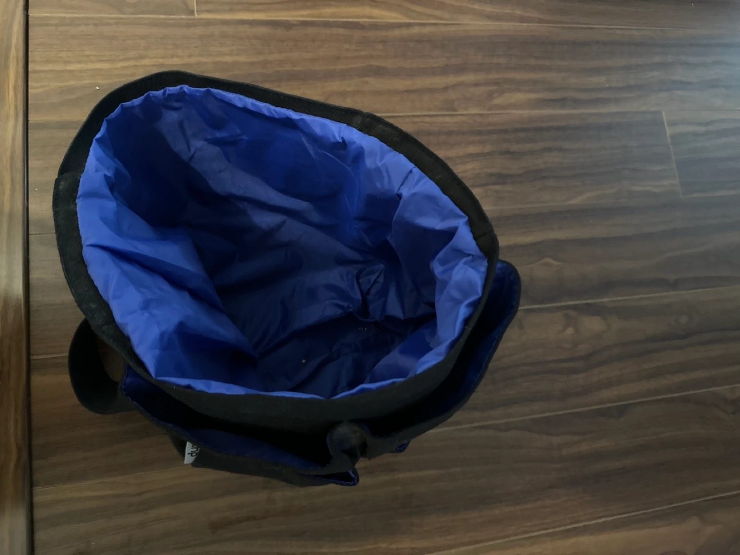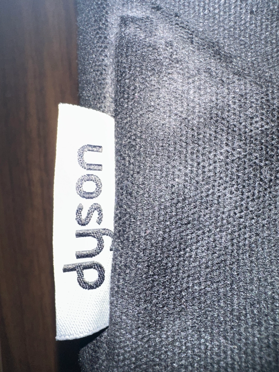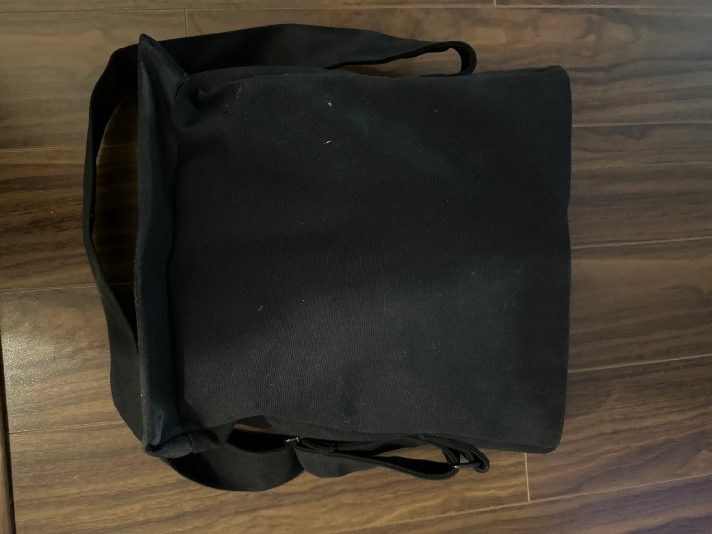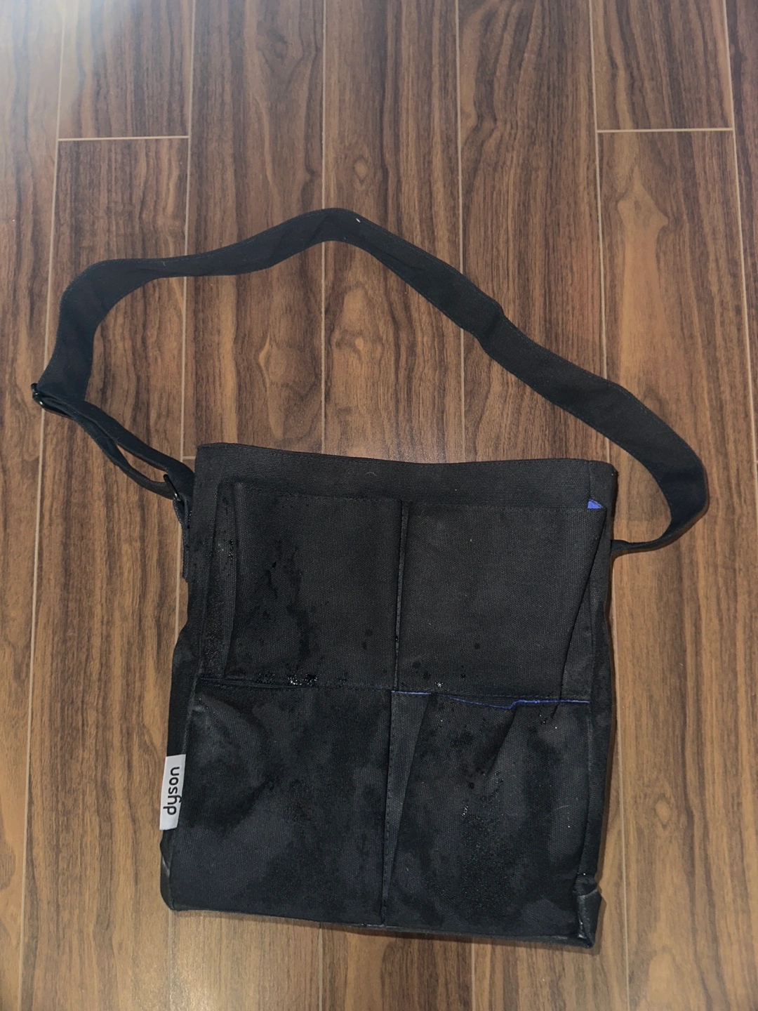 Dyson Black canvas shoulder storage bag. Multiple compartments. Blue lining. Adjustable strap.