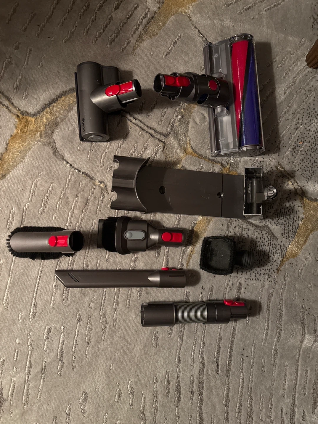 71Dyson stick vacuum attachments (full set of 8 pieces including both large and small power brush heads and docking station, crevice tool, upholstery tool, various brushed tools), brand new, fits Dyson V7 - V15 models. All in perfect condition and fully functional.