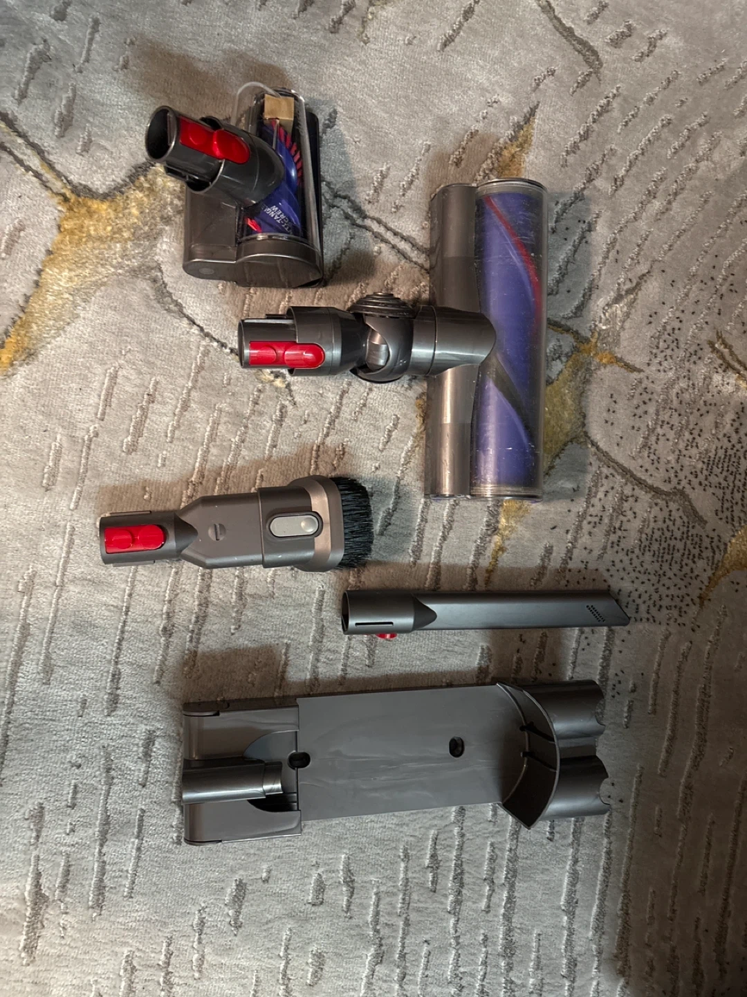 71Dyson stick vacuum attachments (5 pieces including docking station). Large power brush head gently used, all other tools new. Excellent condition and fully functional. Compatible with V7 - V15 models.