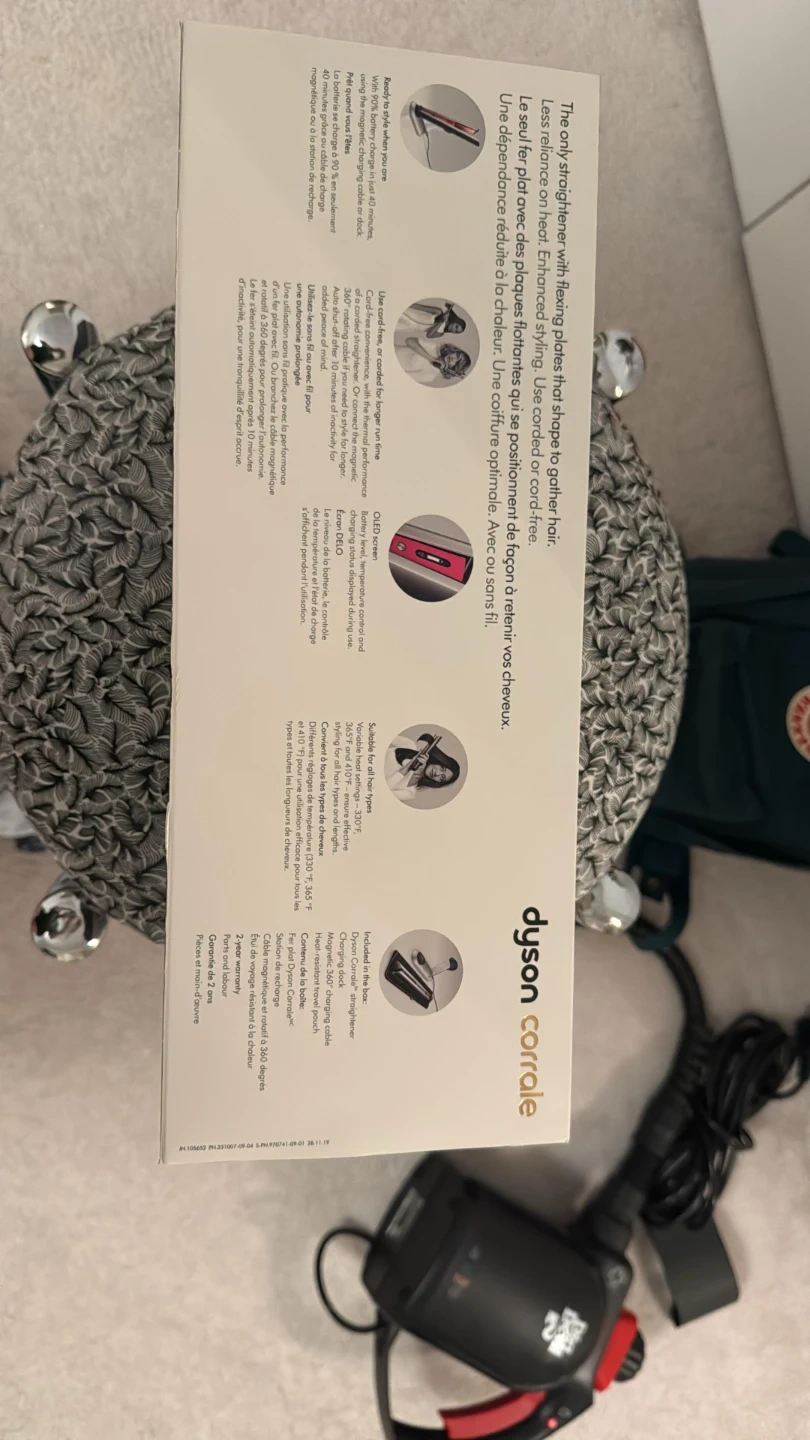 1000+Selling a Dyson Corrale hair straightener in great condition! It comes with the charging dock, magnetic 360° charging cable, and heat-resistant travel pouch. The box is included, making it easy to store and transport. It's designed with flexing plates to shape and gather hair, offering enhanced styling with less reliance on heat. A great tool for achieving a salon-quality look at home! Pick up only at Distillery district No haggling please.