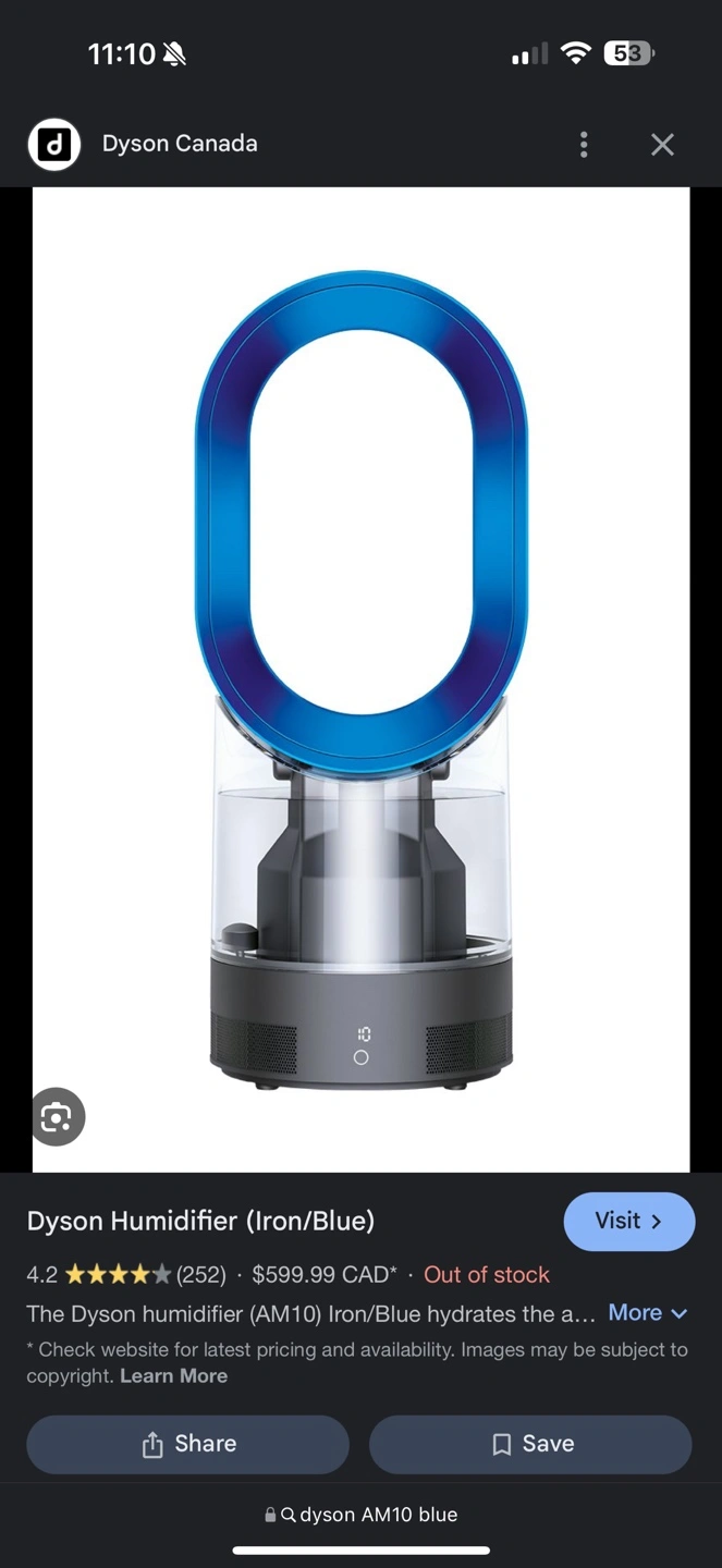 142Dyson humidifier, iron/blue colour. Model AM10. Hydrates the air.