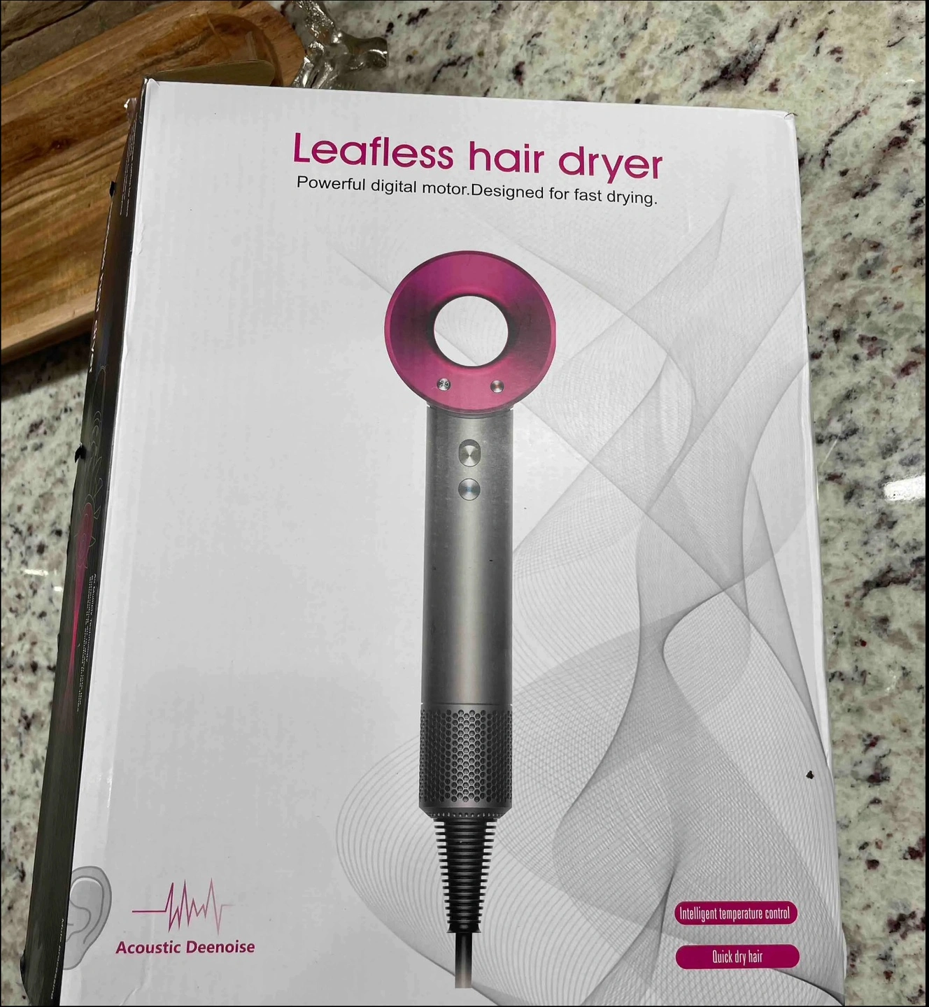 Selling a Dyson leafless hair dryer! It features a powerful digital motor designed for fast drying. The box also mentions acoustic deenoise and intelligent temperature control for a better experience. Box included!