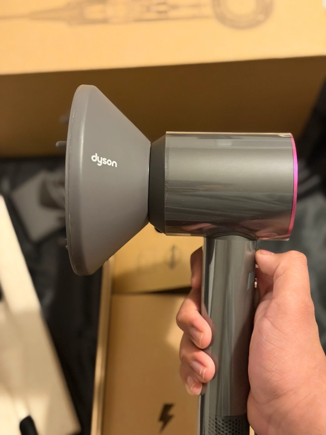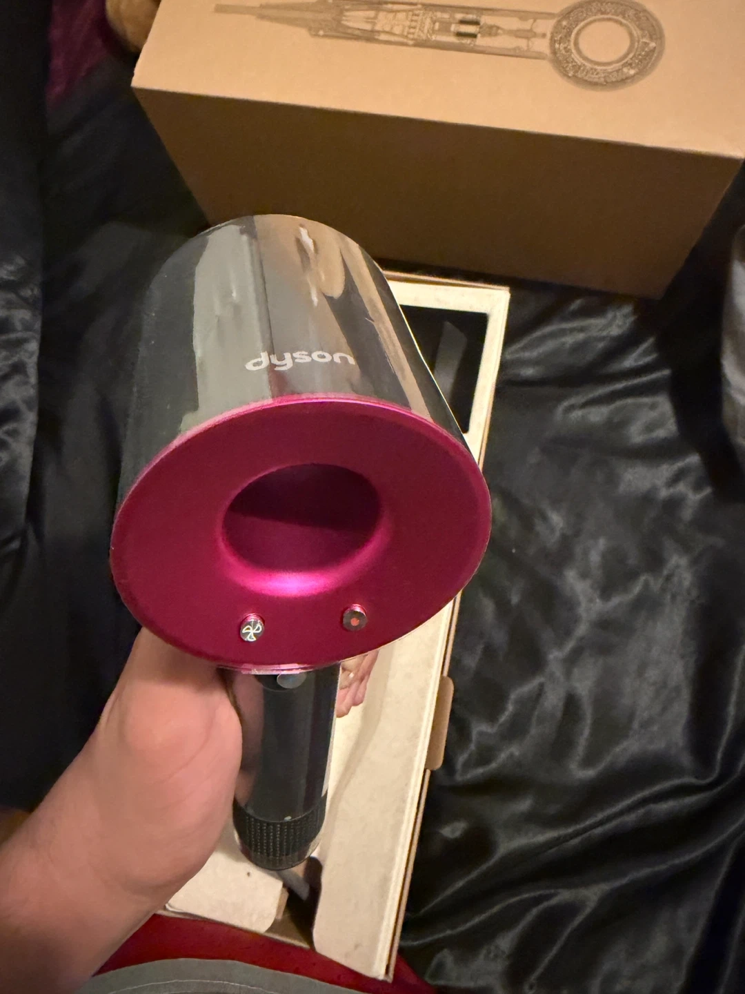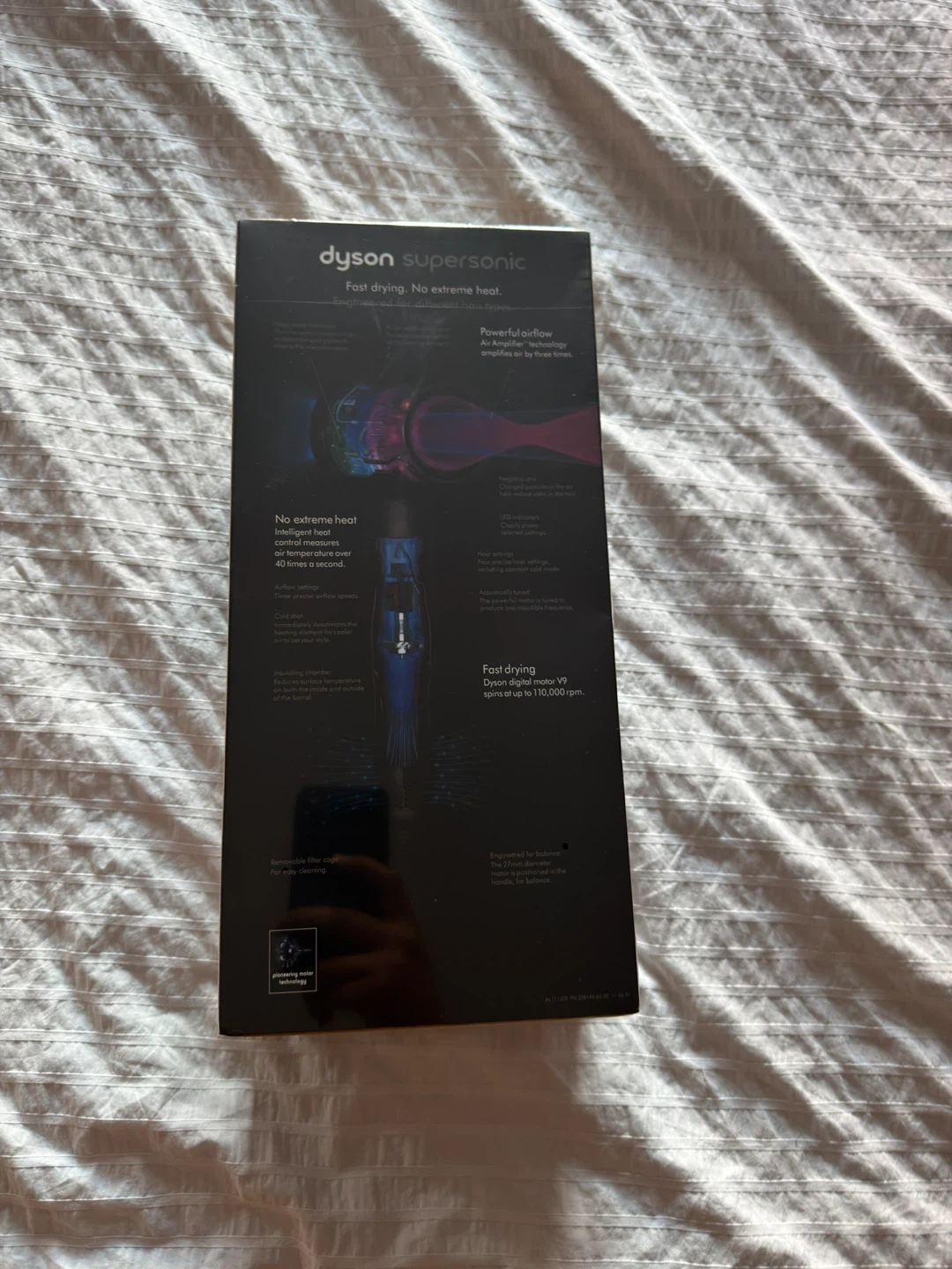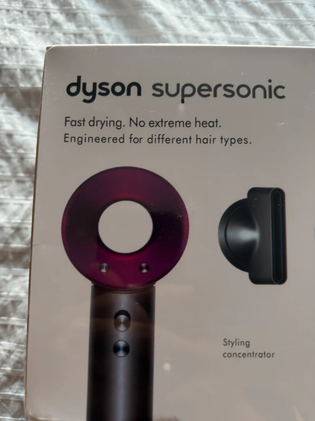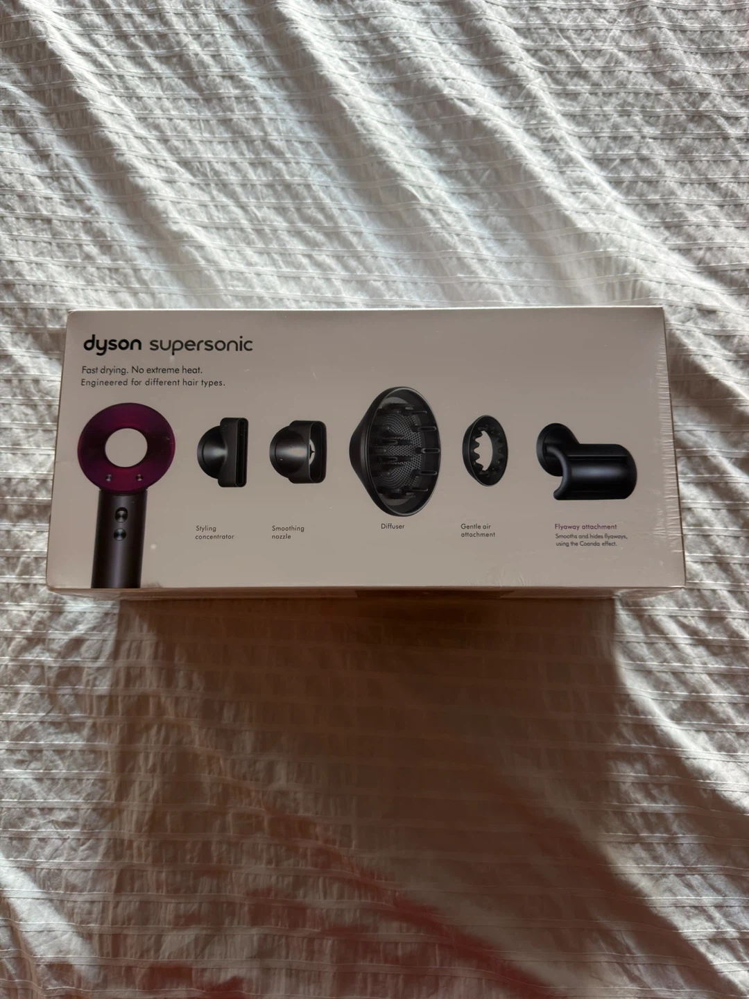 16Selling a Dyson Supersonic hair dryer. It's designed for fast drying without extreme heat, and engineered for different hair types. It comes with various attachments including a styling concentrator, smoothing nozzle, diffuser, gentle air attachment, and flyaway attachment. The powerful airflow is thanks to the Dyson digital motor V9, which spins at up to 110,000 rpm! The box is included