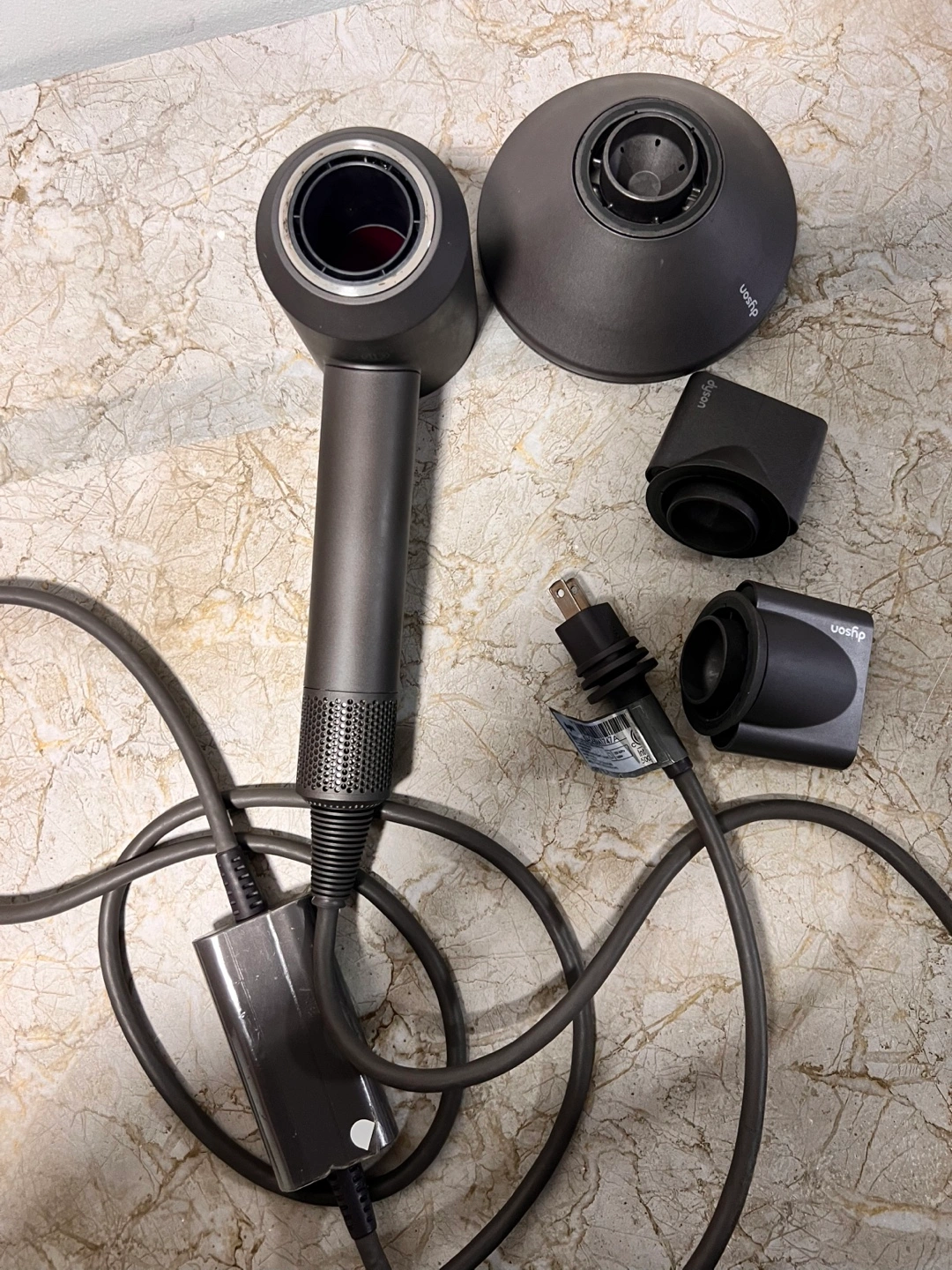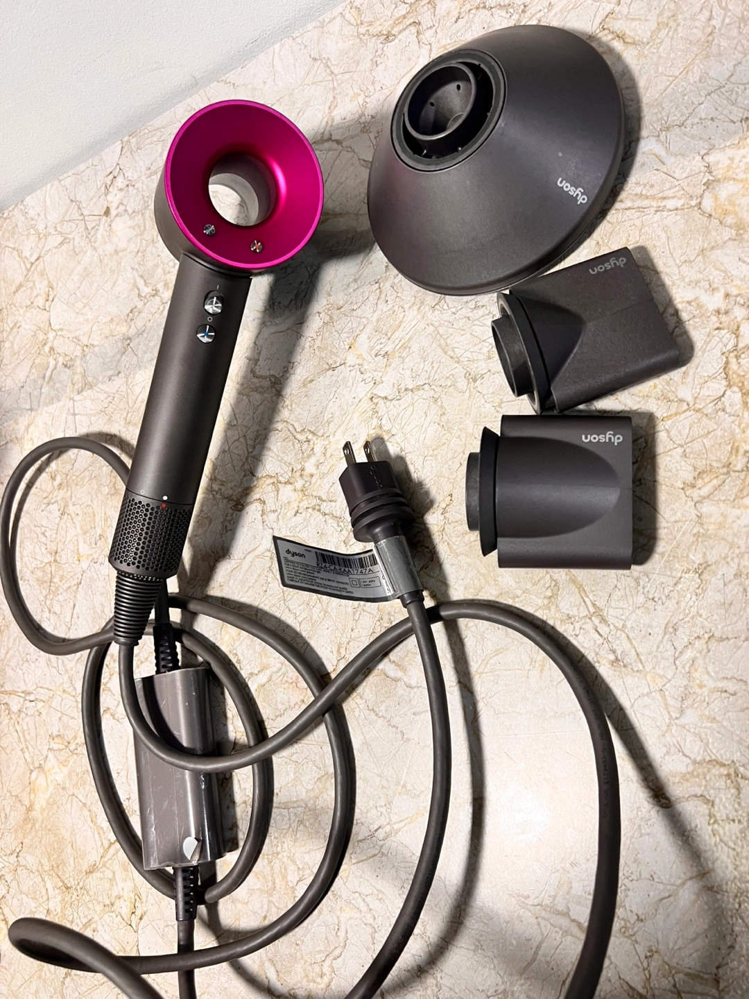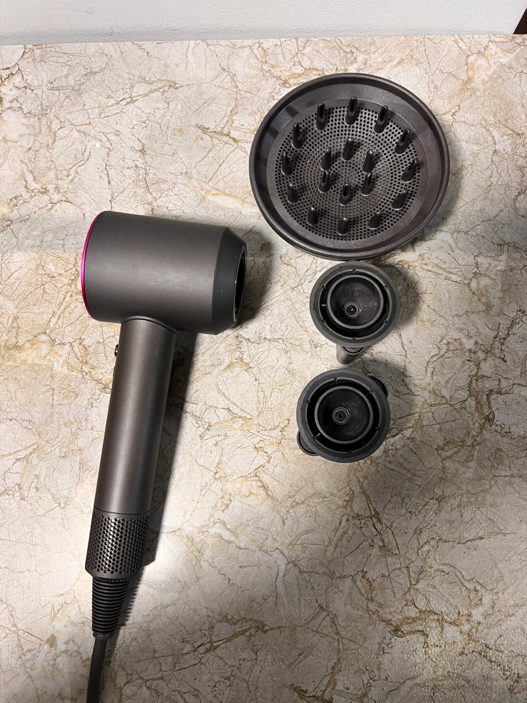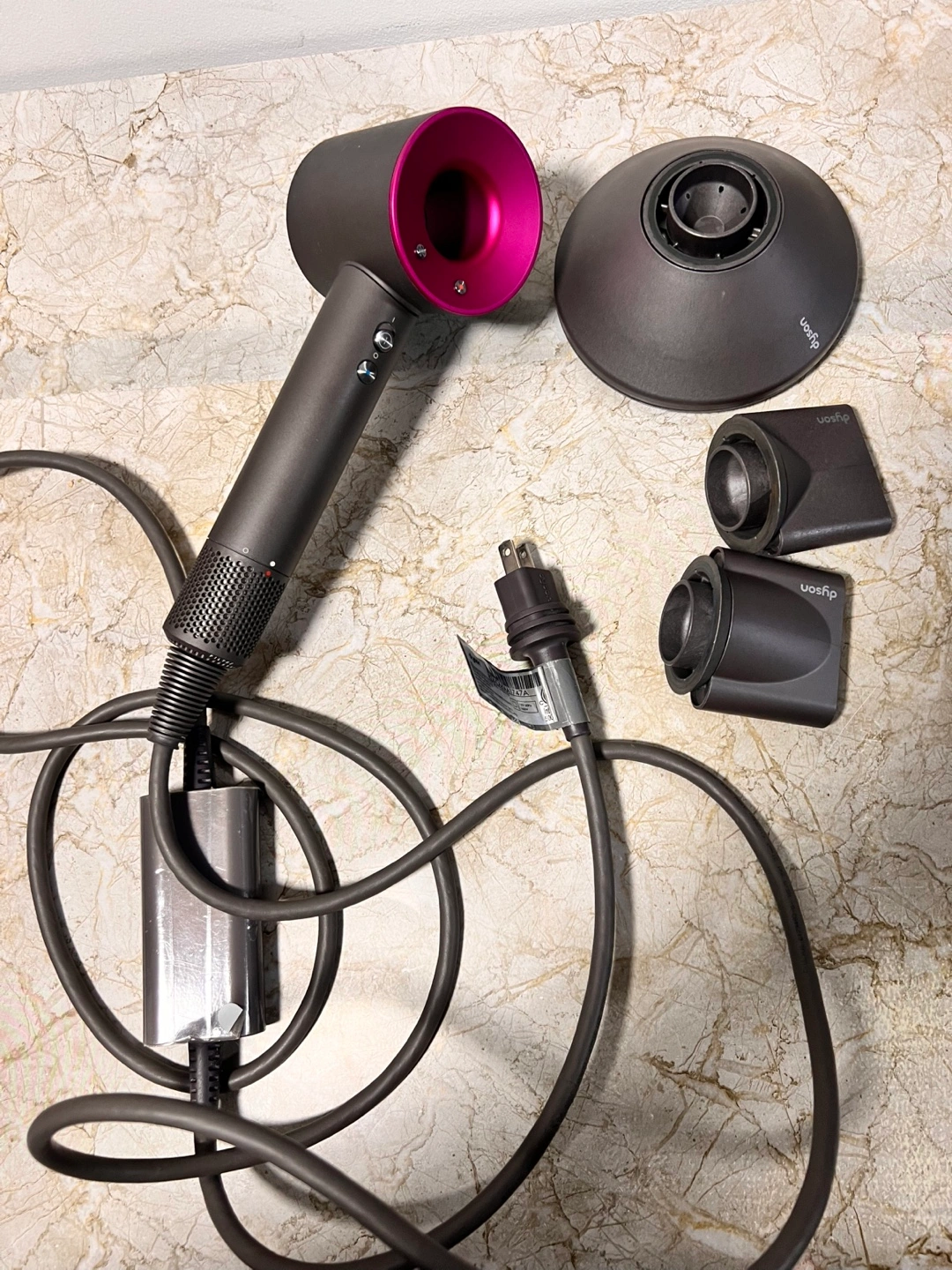 Selling a Dyson Supersonic hair dryer. It comes with all the attachments you see in the photos. Great for quick and efficient hair drying! Gently used and works well. Selling it off because I got a Dyson Air wrap.