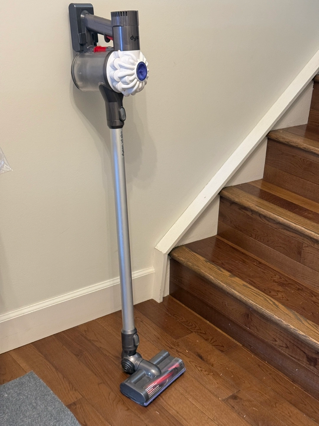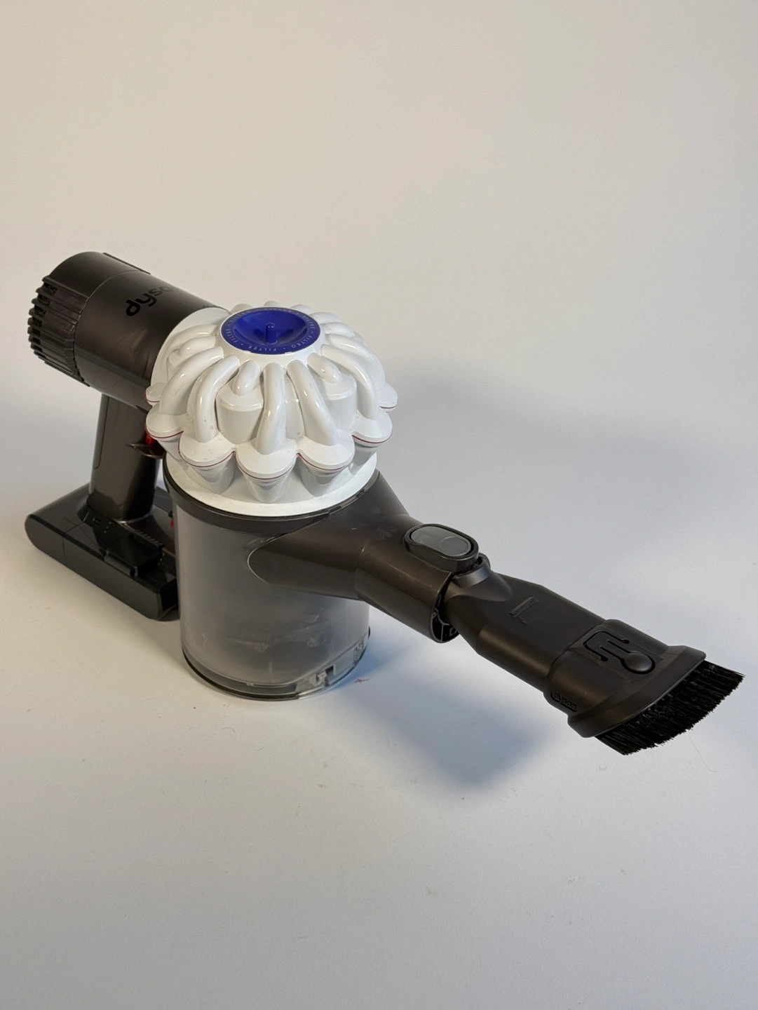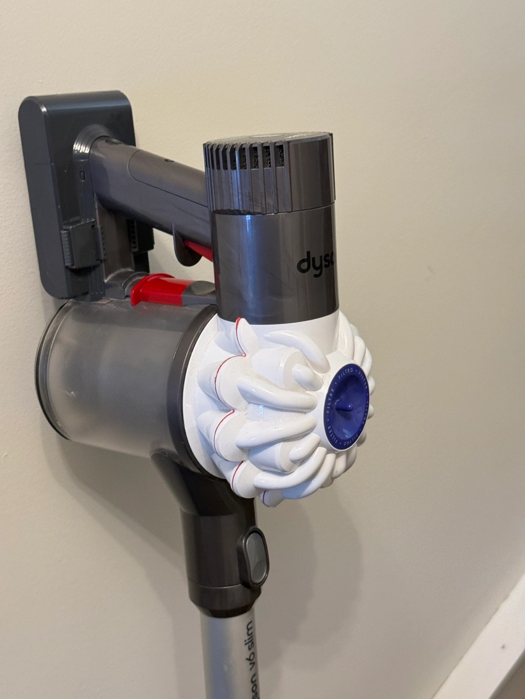 Used Dyson V6 slim handheld vacuum. Includes charging dock and various attachments. Cordless vacuum cleaner. Brand new battery. Comes with charger several attachments and a hanging mechanism for wall.