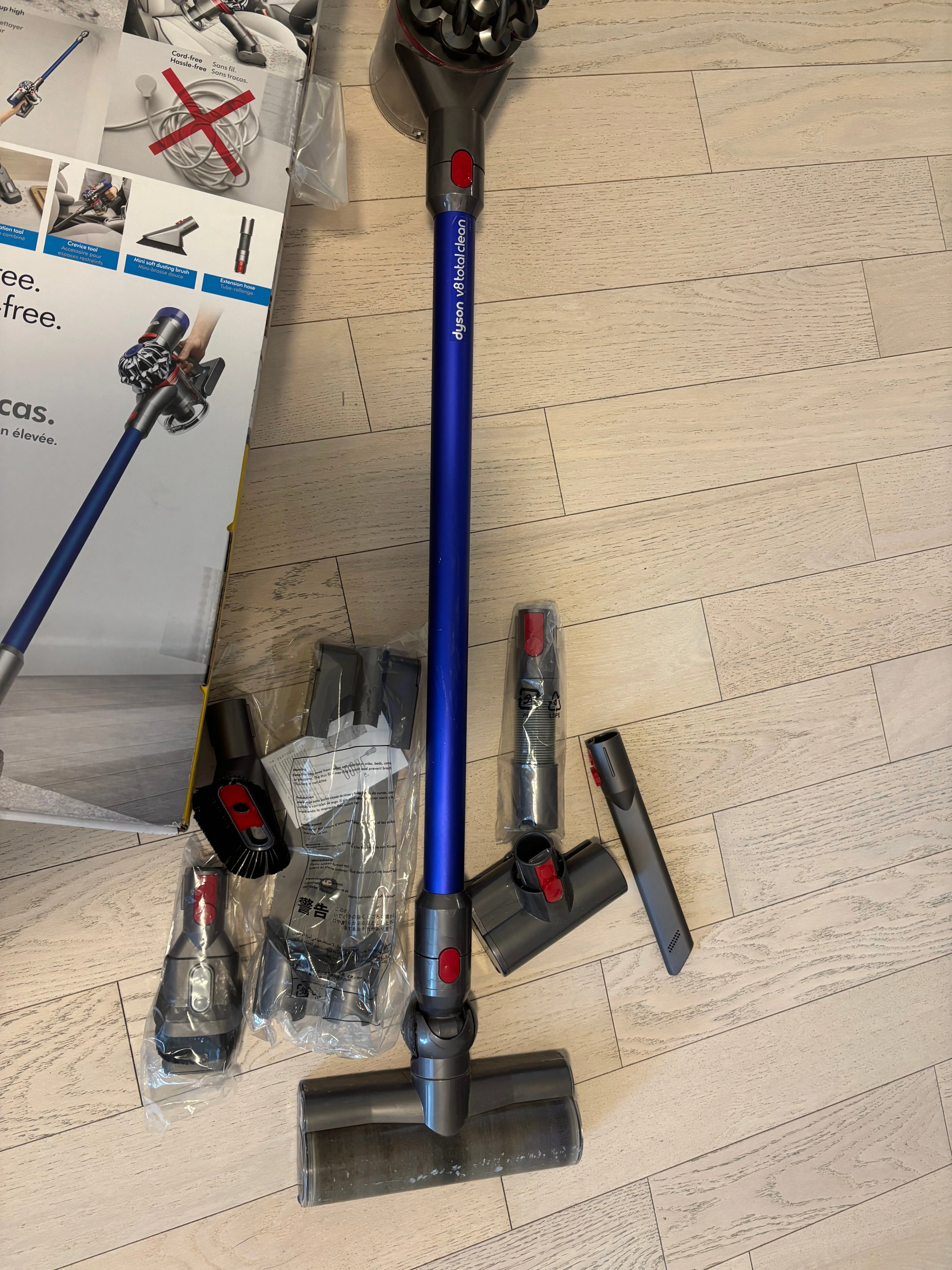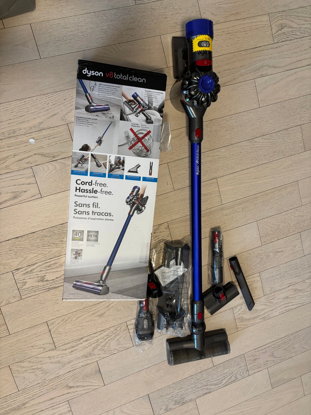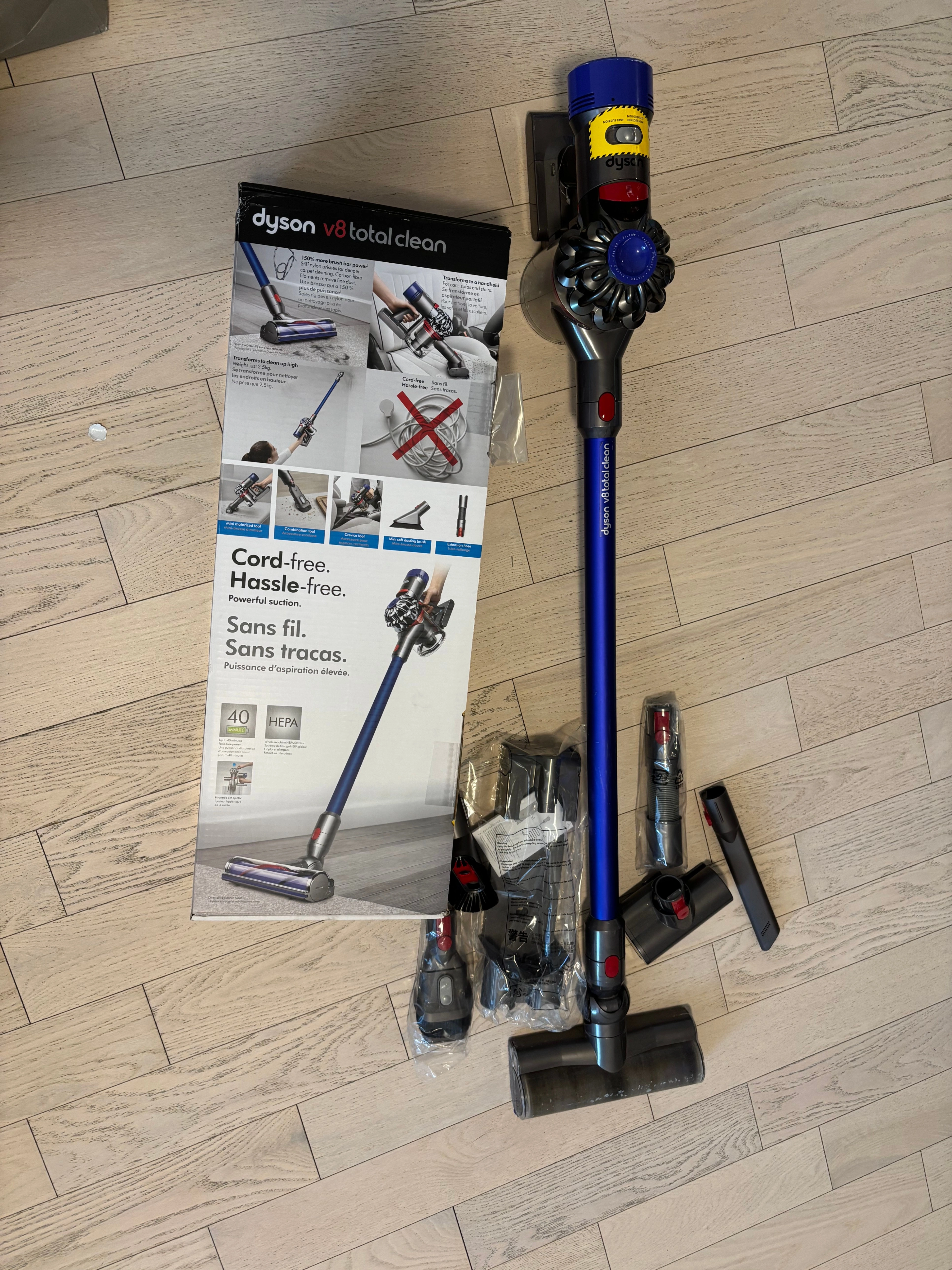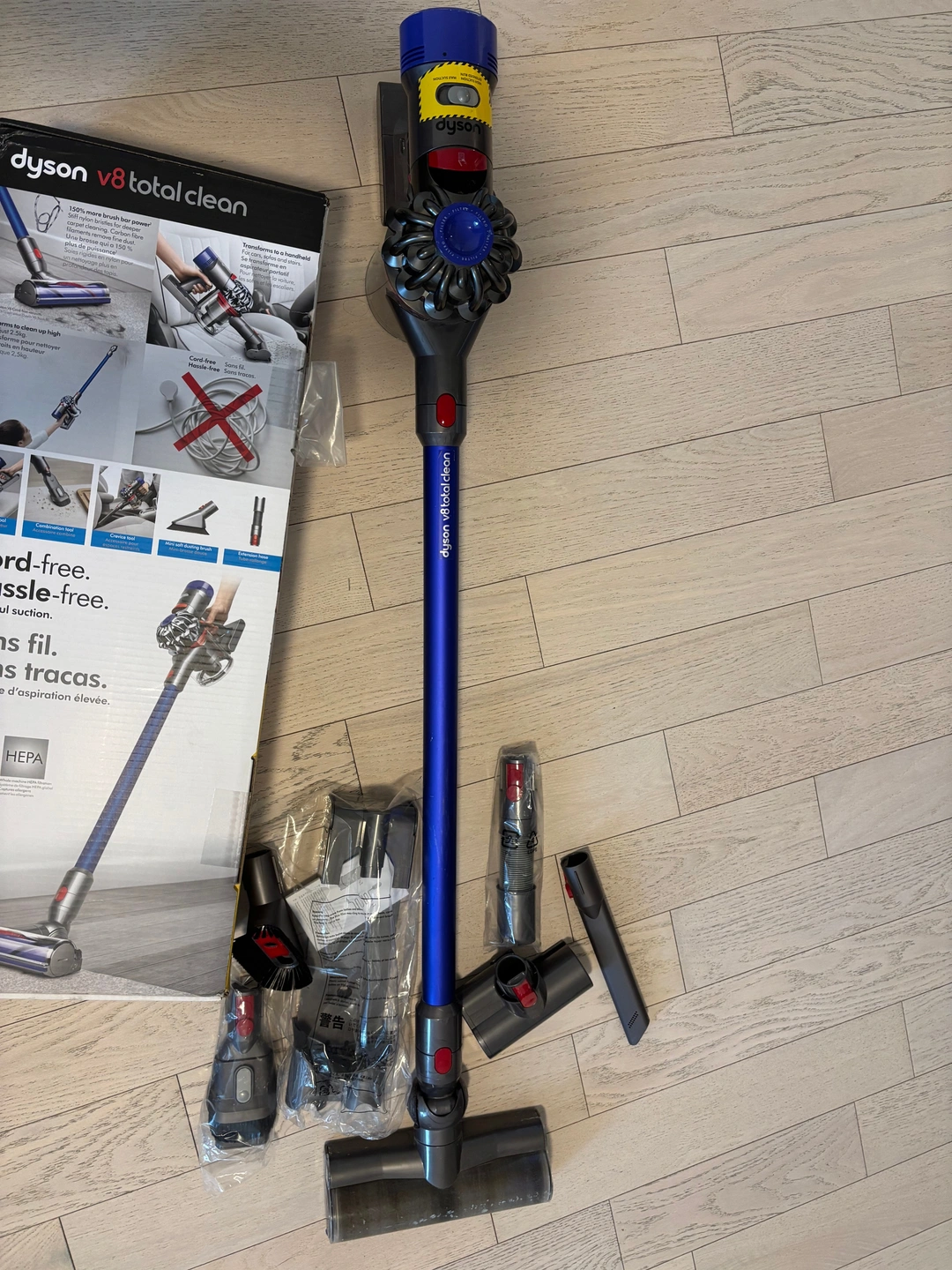 40Dyson V8™ Pet Cordless Stick Vacuum packs the power of a full-size vacuum into a lightweight, versatile design. Delivering up to 40 minutes of fade-free suction on both carpets and hard floors, this cordless powerhouse uses Dyson's advanced V8 motor to tackle tough messes. With the combination tool, you can easily clean high and low, and it quickly transforms into a handheld for tackling upholstery, curtains and car interiors. Weighs under 2.7kg Max Mode provides up to 5 minutes of high suction power for more difficult tasks Includes Hair Screw Tool: Mini de-tangling brush bar picks up long hair and pet hair In the box: Dyson V8, Motorbar™ cleaner head, wall dock, combi tool, crevice tool, hair screw tool, charger Pet Free and we have purchased in 2023 ,some cleaning parts of vaccum we haven't used them at all