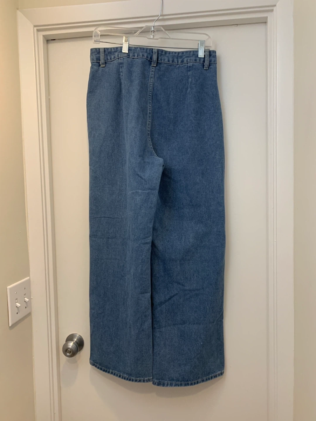 Classic blue denim pants with a wide leg silhouette. These feature a mid-rise waist and classic five-pocket styling. Casual and comfortable for everyday wear!