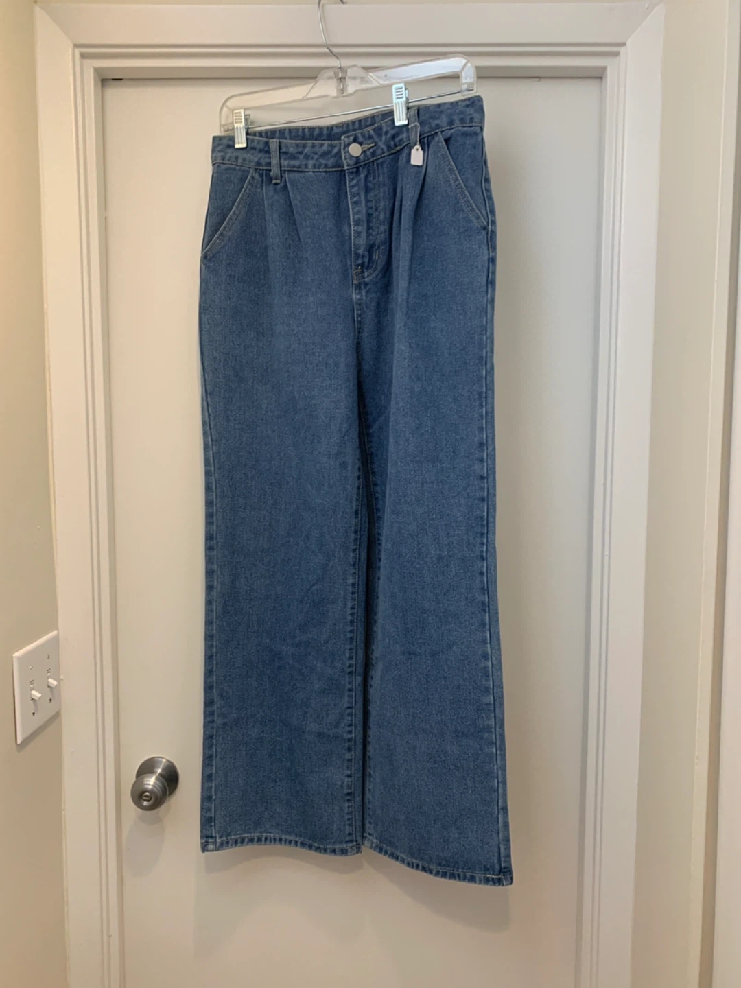 Classic blue denim pants with a wide leg silhouette. These feature a mid-rise waist and classic five-pocket styling. Casual and comfortable for everyday wear!