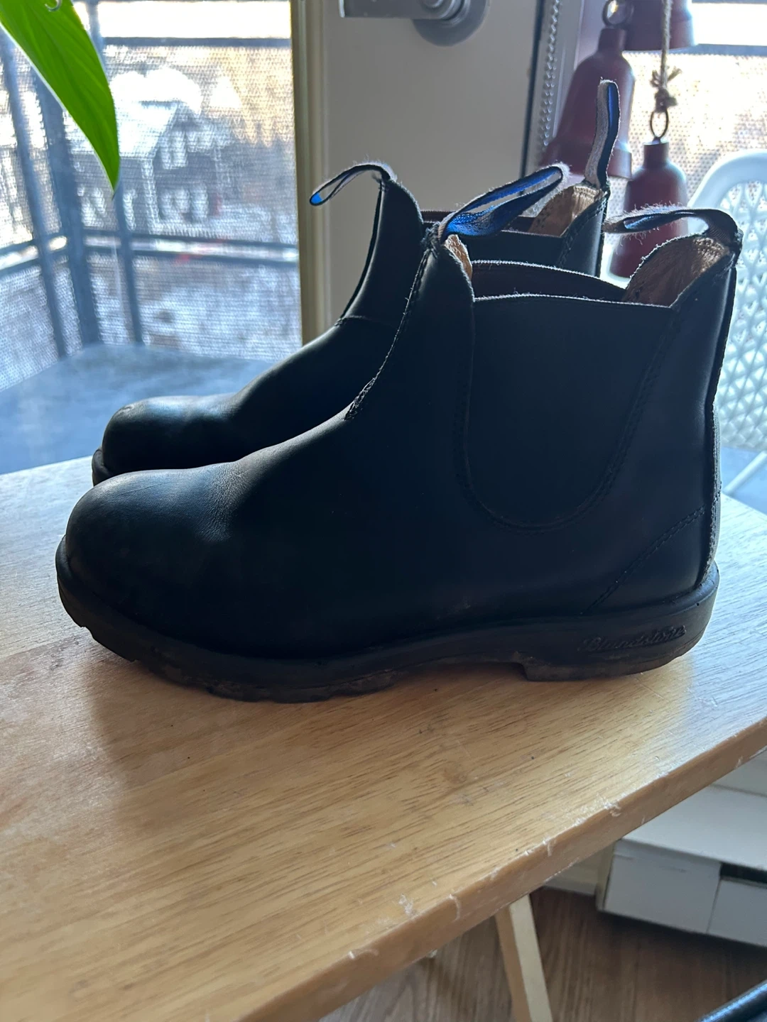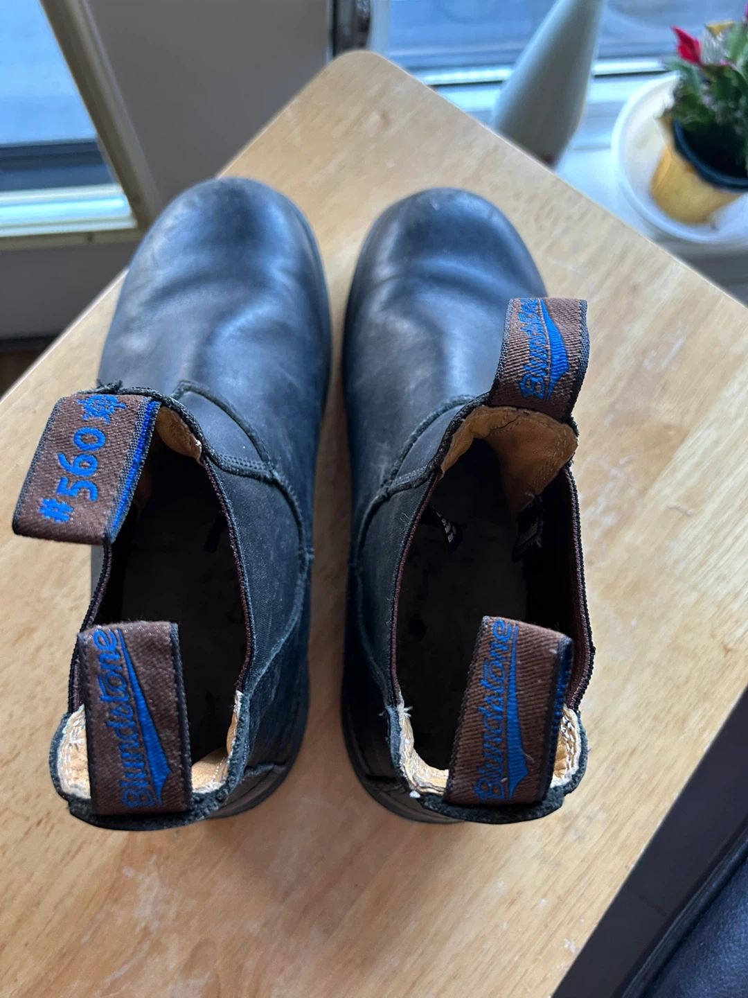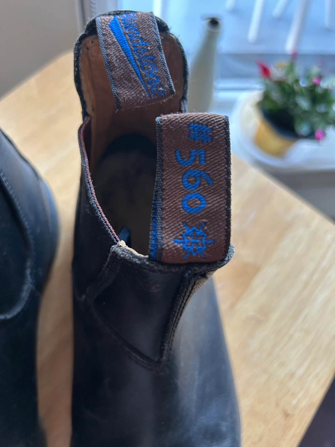 These are Blundstone 560 elastic-sided boots. They're made with black leather. They're a popular choice for work and casual wear. They're comfortable and durable!