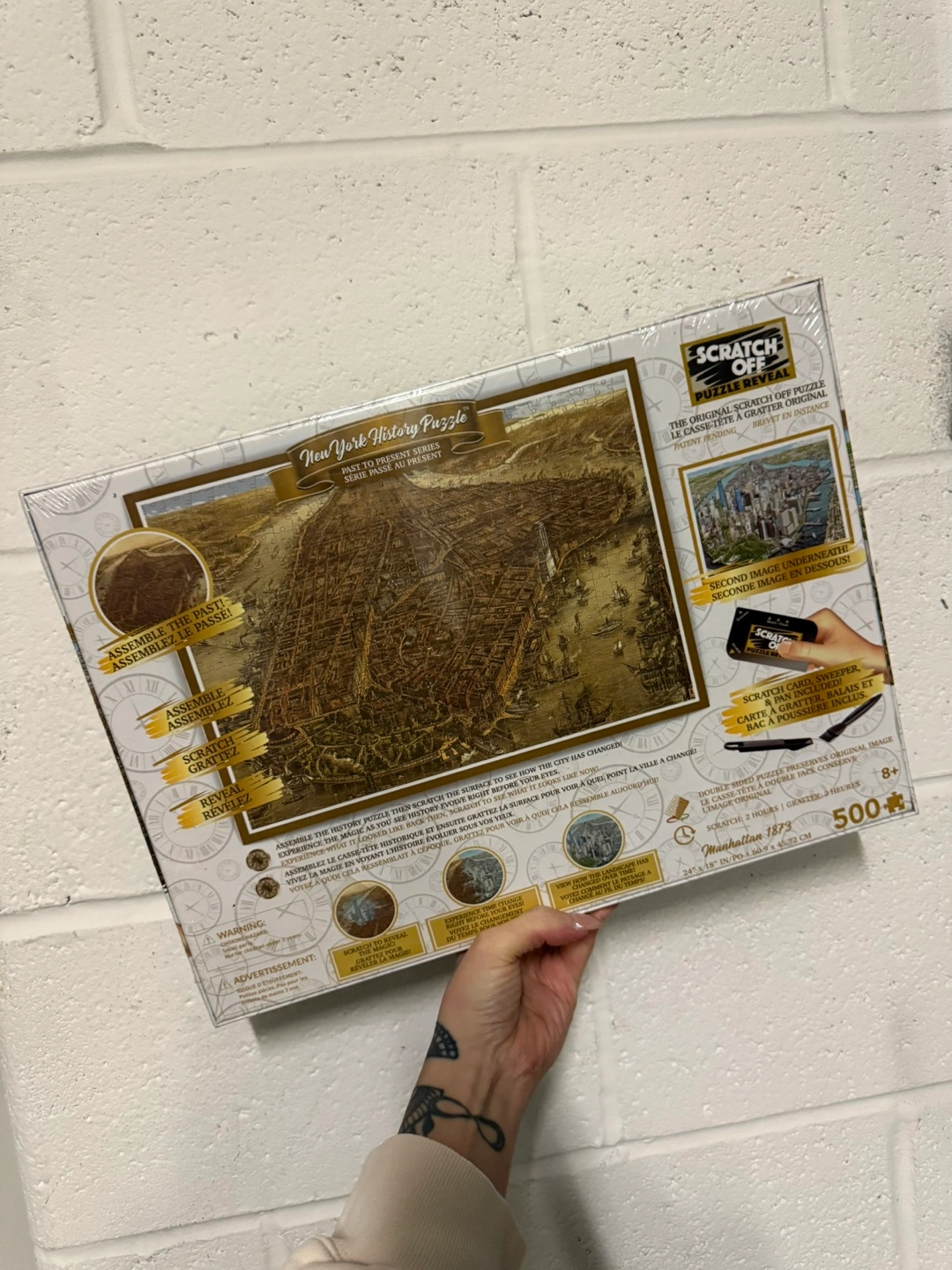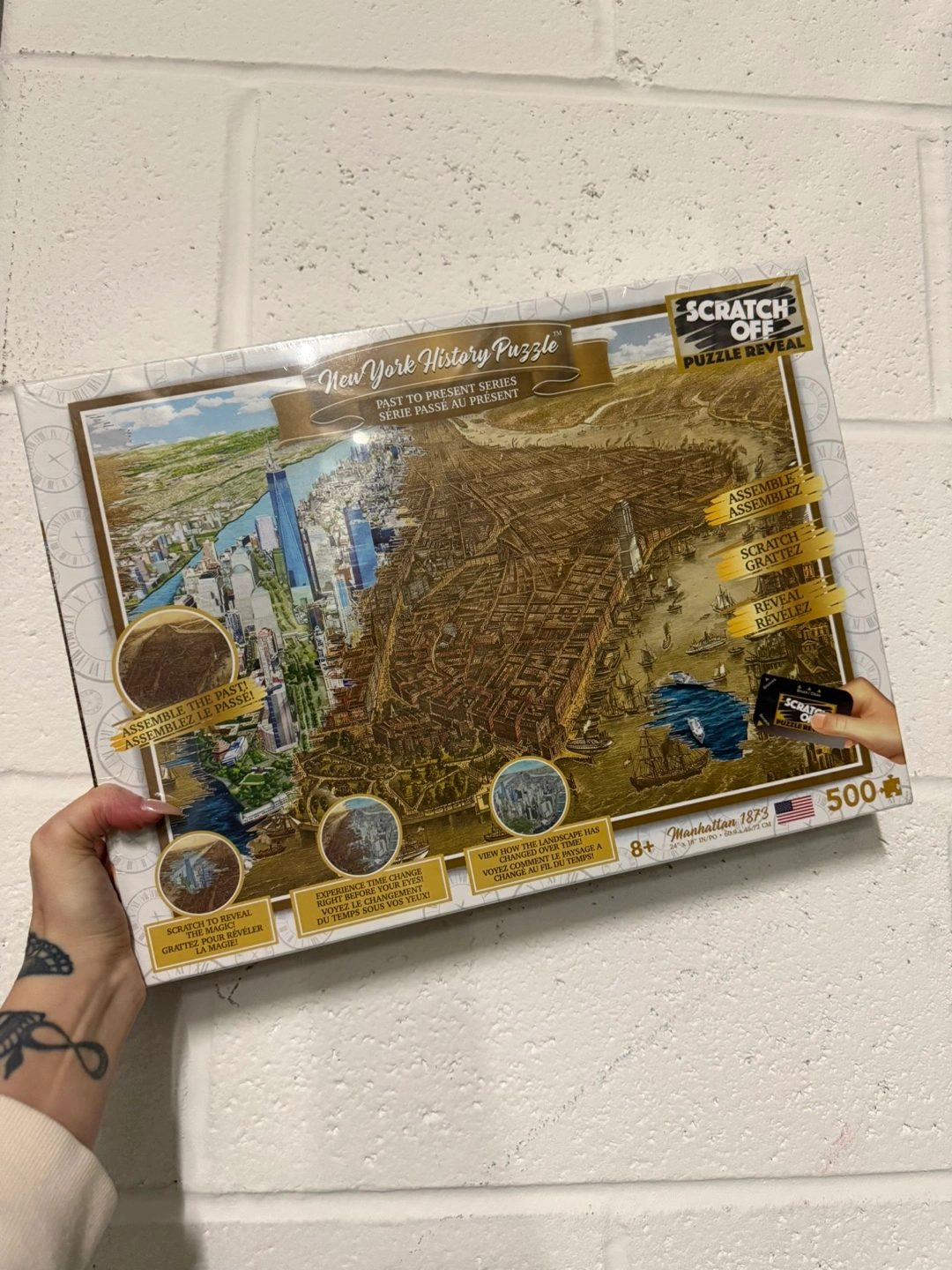 500-piece puzzle featuring a scratch-off element. Past to present New York City images. Assemble the puzzle, then scratch to reveal. Fun for puzzle lovers.