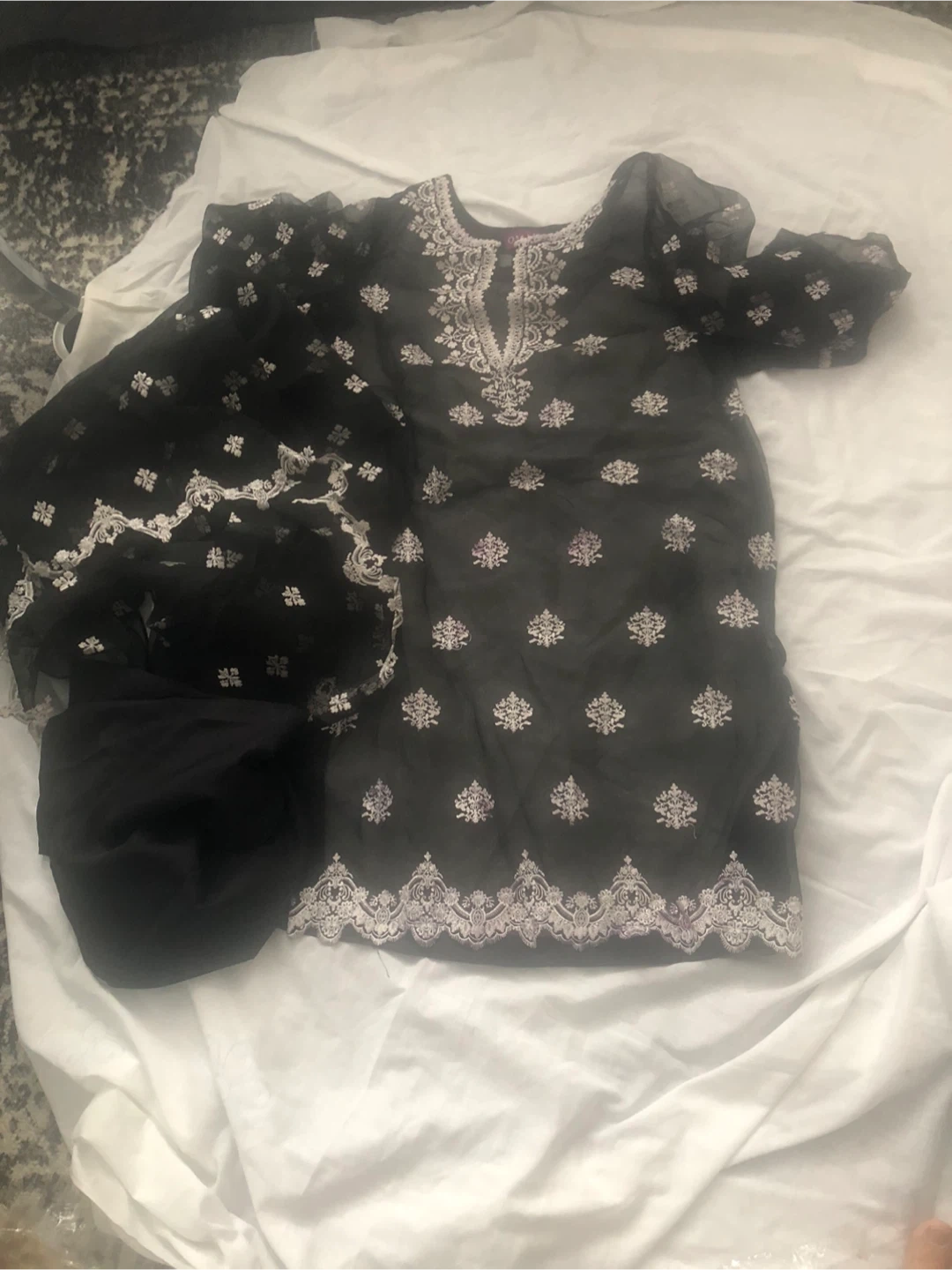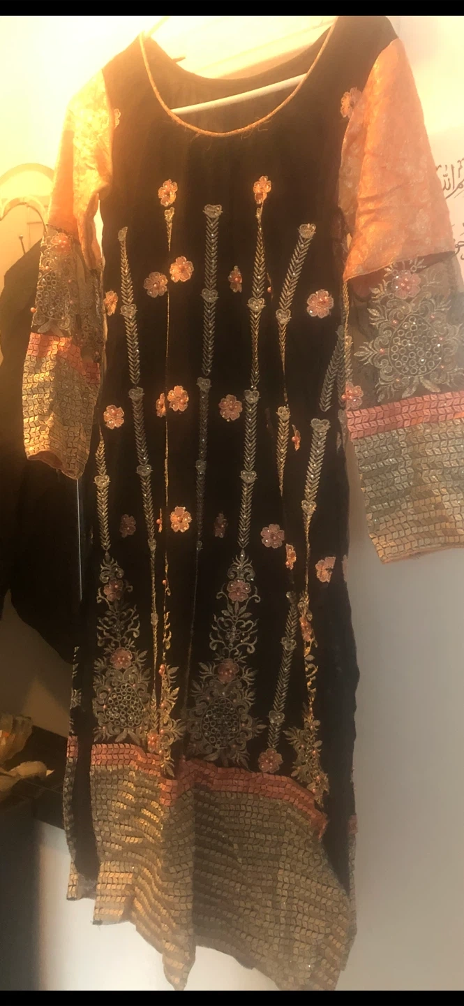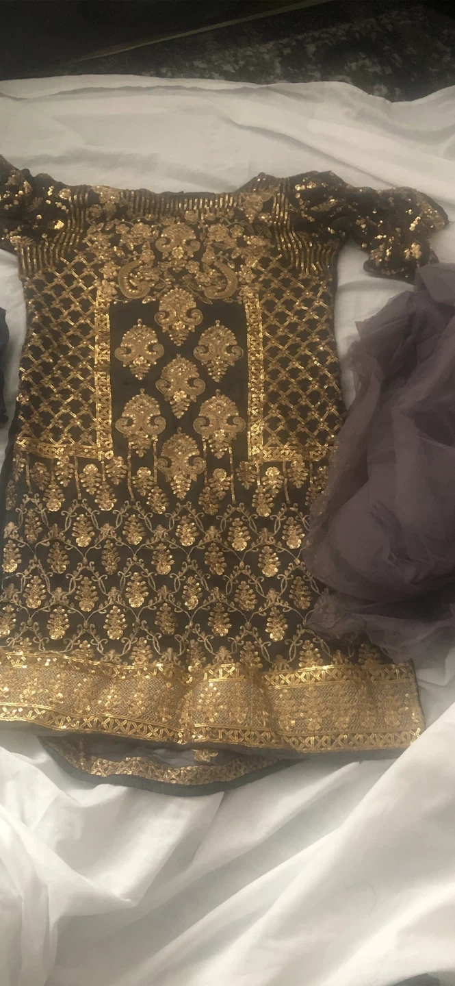 Collection of ornate salwar kameez suits. Each piece features intricate embroidery and embellishments, with matching dupattas and bottoms included. Various colours and designs available for festive occasions.