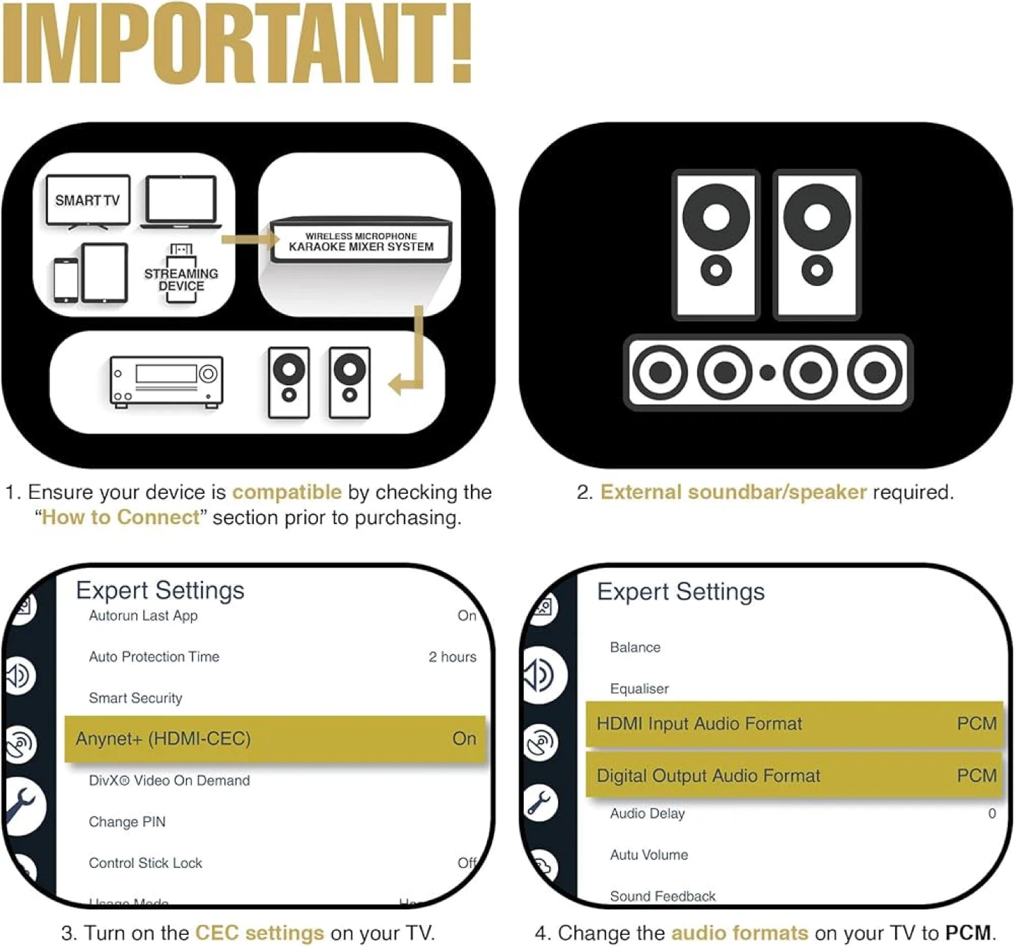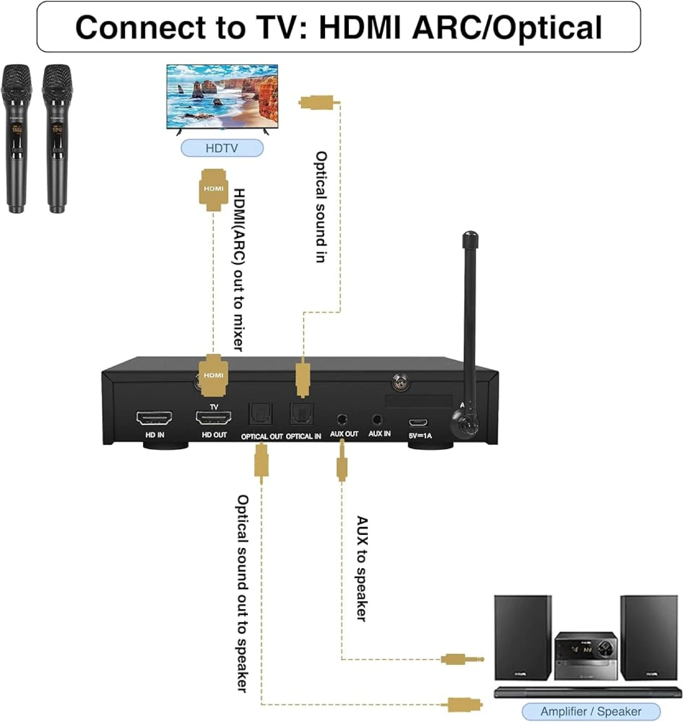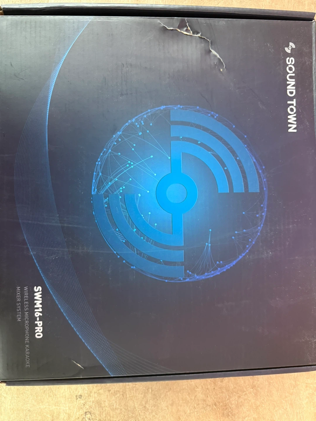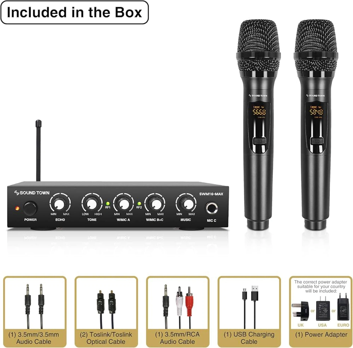 This is a Sound Town SWM16-Pro wireless microphone system. It includes two microphones, a receiver, and various cables for connection. The system supports HDMI ARC and optical audio inputs.