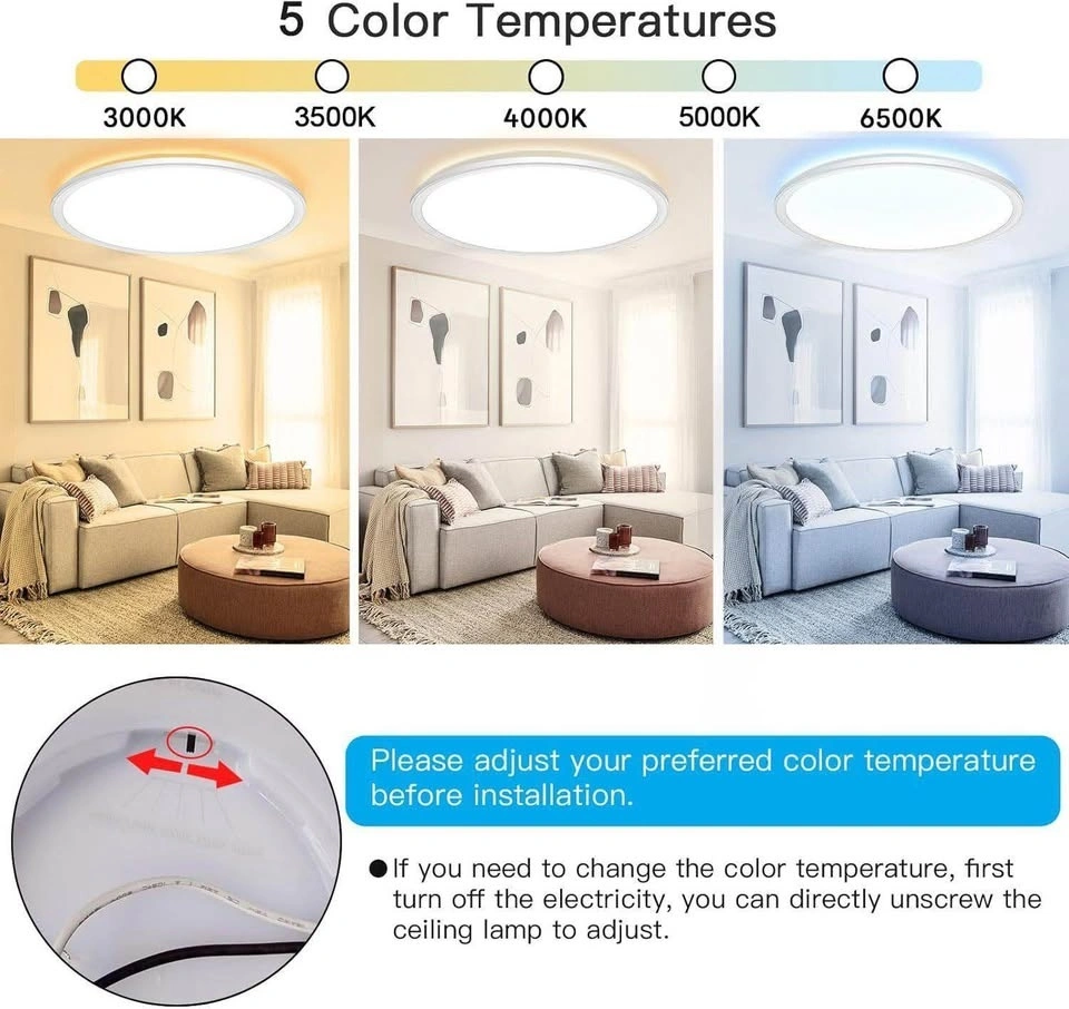 This ceiling light features flicker-free LED beads and an opaline PC housing for soft, glare-free illumination. It has a high color rendering index (80) to show true colors, making rooms look bright and nice. Installation is made easy with an included chain hook, allowing for quick connection of wires. The fixture is FCC/IC certified and built with a high-quality, insulated fireproof plastic housing for safety, including short circuit protection and no need for an earth wire. Its hermetic design prevents dust and moisture ingress. This 56W LED light saves 85% energy compared to 150W incandescent bulbs and has a lifespan of up to 30,000 hours. The ultra-thin, minimalist design (2.5cm) fits flush with the ceiling for a modern, spacious look. Ideal for living rooms, bedrooms, kitchens, and more.