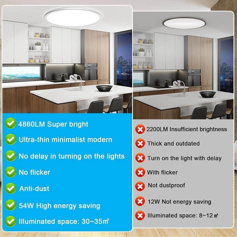 This ceiling light features flicker-free LED beads and an opaline PC housing for soft, glare-free illumination. It has a high color rendering index (80) to show true colors, making rooms look bright and nice. Installation is made easy with an included chain hook, allowing for quick connection of wires. The fixture is FCC/IC certified and built with a high-quality, insulated fireproof plastic housing for safety, including short circuit protection and no need for an earth wire. Its hermetic design prevents dust and moisture ingress. This 56W LED light saves 85% energy compared to 150W incandescent bulbs and has a lifespan of up to 30,000 hours. The ultra-thin, minimalist design (2.5cm) fits flush with the ceiling for a modern, spacious look. Ideal for living rooms, bedrooms, kitchens, and more.