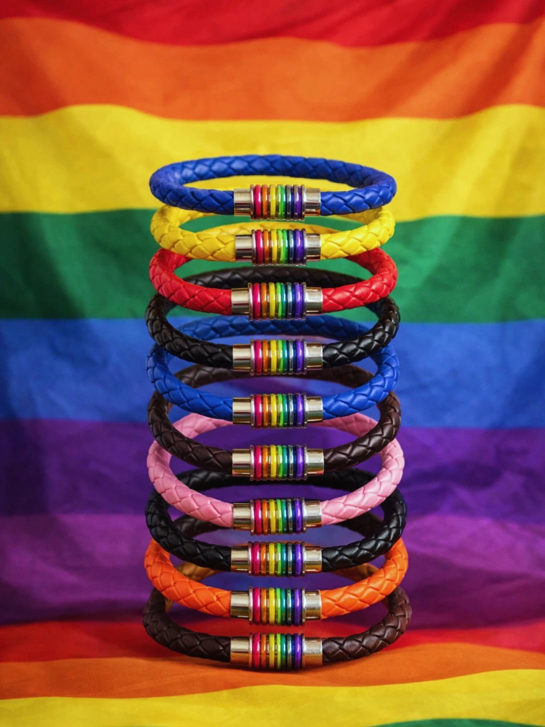 This set includes multiple braided leather bracelets, each featuring a rainbow-striped magnetic clasp. They come in various colours like blue, yellow, red, black, pink, orange, and brown. These bracelets add a pop of colour and are a great way to show your pride!