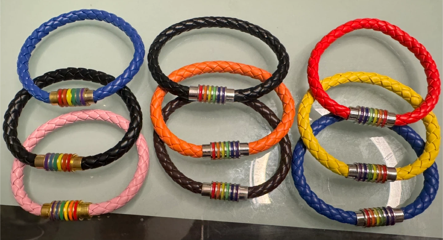 This set includes multiple braided leather bracelets, each featuring a rainbow-striped magnetic clasp. They come in various colours like blue, yellow, red, black, pink, orange, and brown. These bracelets add a pop of colour and are a great way to show your pride!