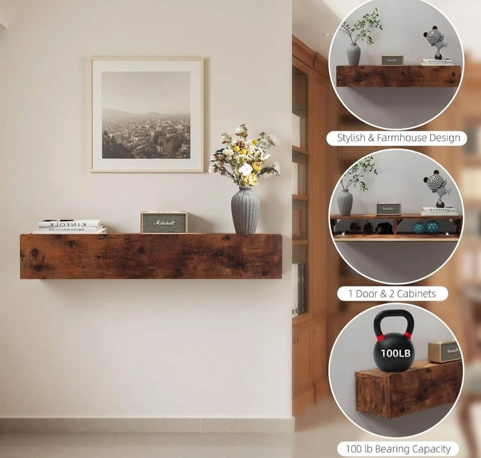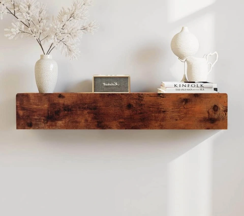 Brand new floating solid wood console table in rustic brown. Wall-mounted narrow design with storage shelf. Perfect for entryway, hallway, or behind couch.