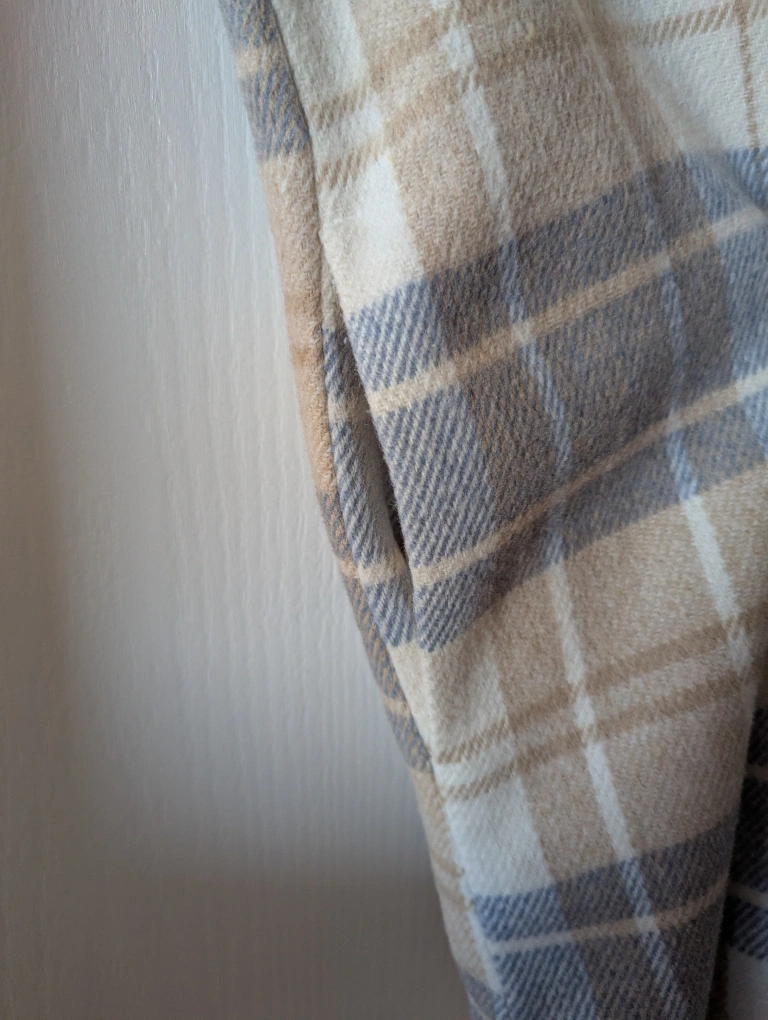 The shirt has a button-up front, two front pockets, two side pockets and a stylish plaid pattern. This calf length vest is perfect for layering or wearing on its own during warmer weather