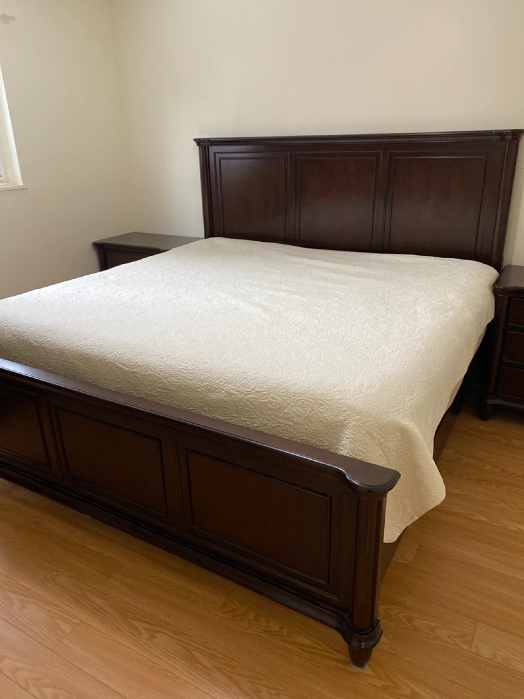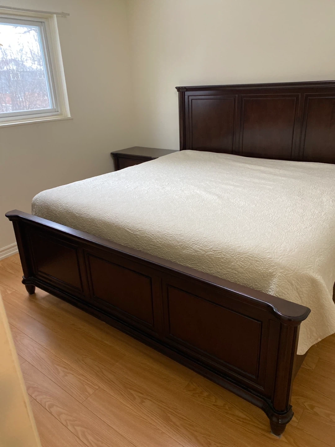 This is a quality King Size Bedroom Set that includes the two end tables, the head board and footboard, split box frame with slats, including king koil Classic princess mattress. This set is in extremely great condition, is a top mattress and is from a pet free and smoke free home. Mattress measures 76 inches w X 78 inches l X 12 inches high plus the split box underneath. Will include set of sheets.