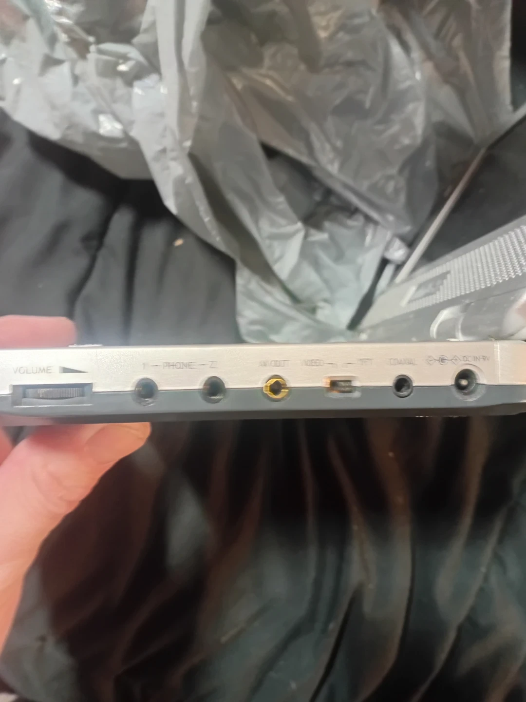 I CANT FIND THE CORD RIGHT NOW .This Mintek portable DVD player features a 7-inch TFT monitor. It's a silver model, MDP-1750. Multiple ports are available, including headphone and DC in.