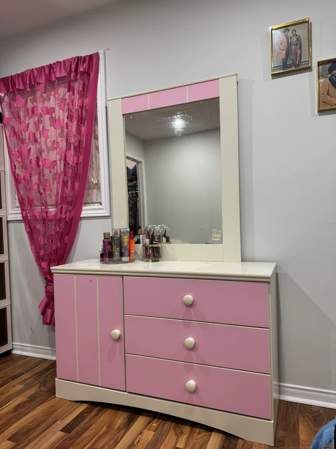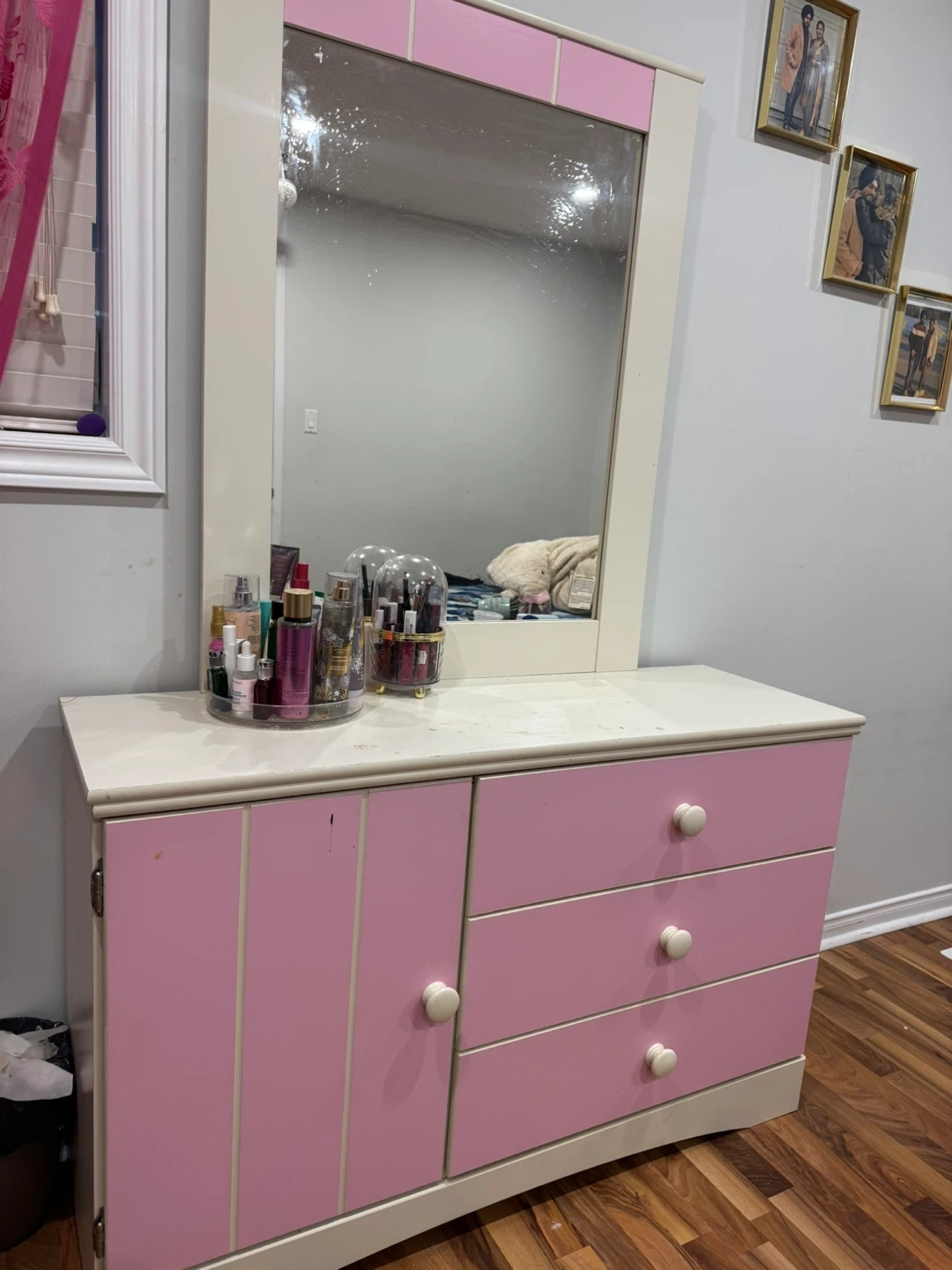 Selling a cute pink and white vanity dresser with a mirror. It has a cabinet and three drawers for storage. Perfect for a bedroom or dressing area! Some marks on top as you can see in the picture