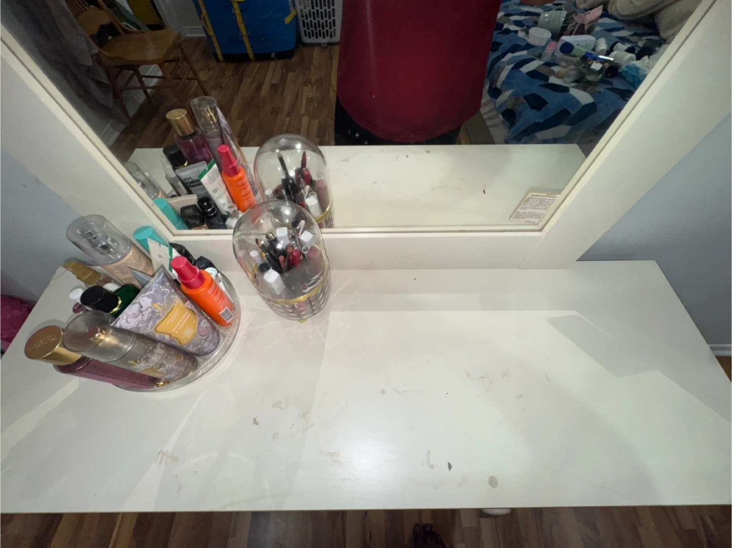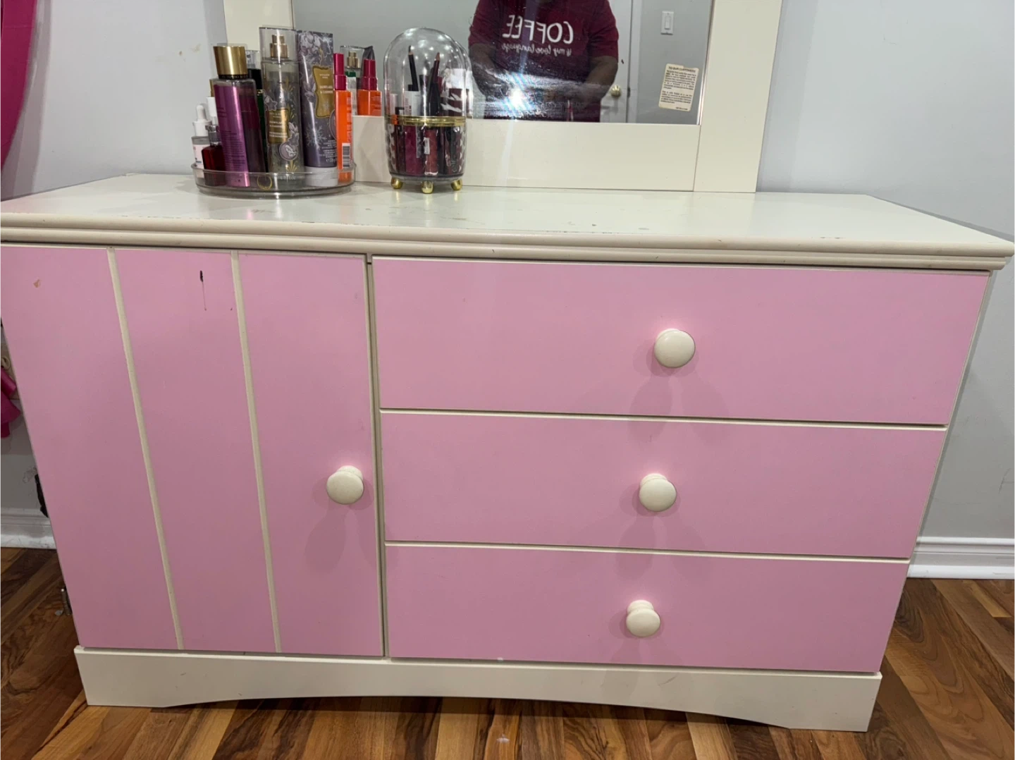 Selling a cute pink and white vanity dresser with a mirror. It has a cabinet and three drawers for storage. Perfect for a bedroom or dressing area! Some marks on top as you can see in the picture
