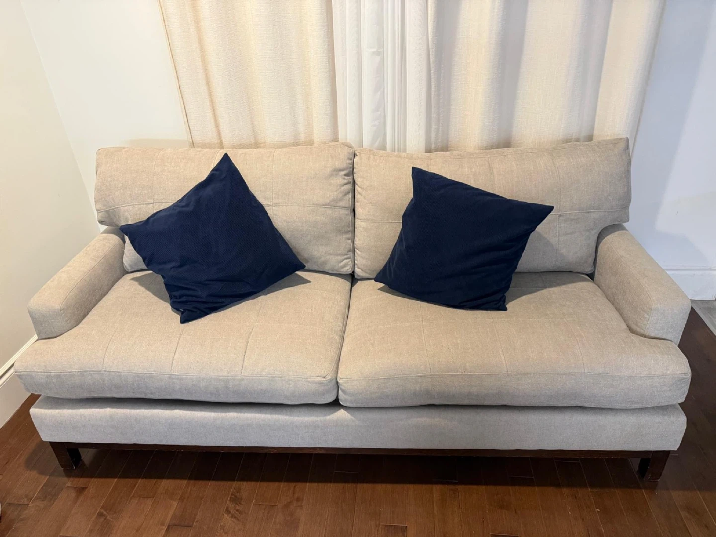 A comfortable beige loveseat sofa. It's upholstered in a textured fabric and comes with two navy blue throw pillows. The sofa has dark wood legs.