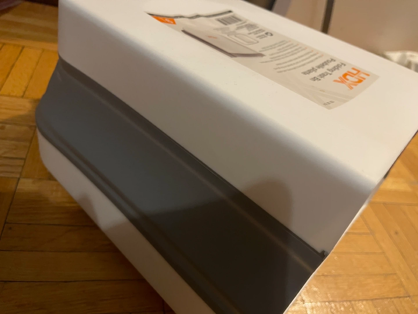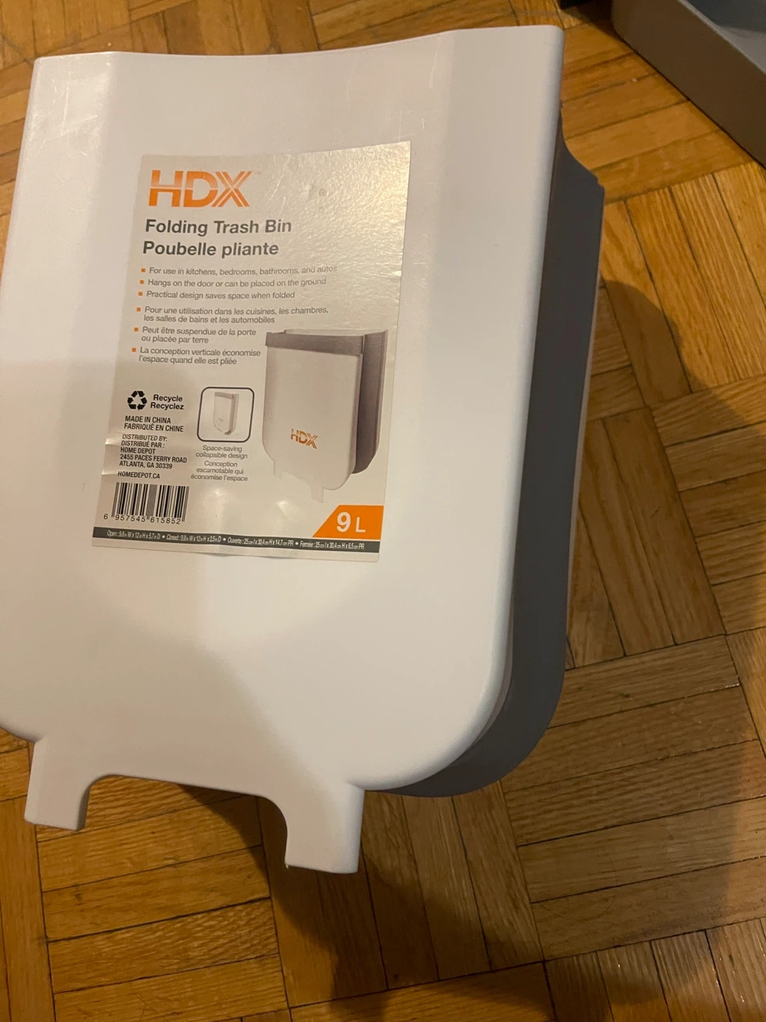 I'm selling an HDX folding trash bin with a 9L capacity. It's perfect for kitchens, bedrooms, bathrooms, and autos. It can hang on the door or be placed on the ground for easy use