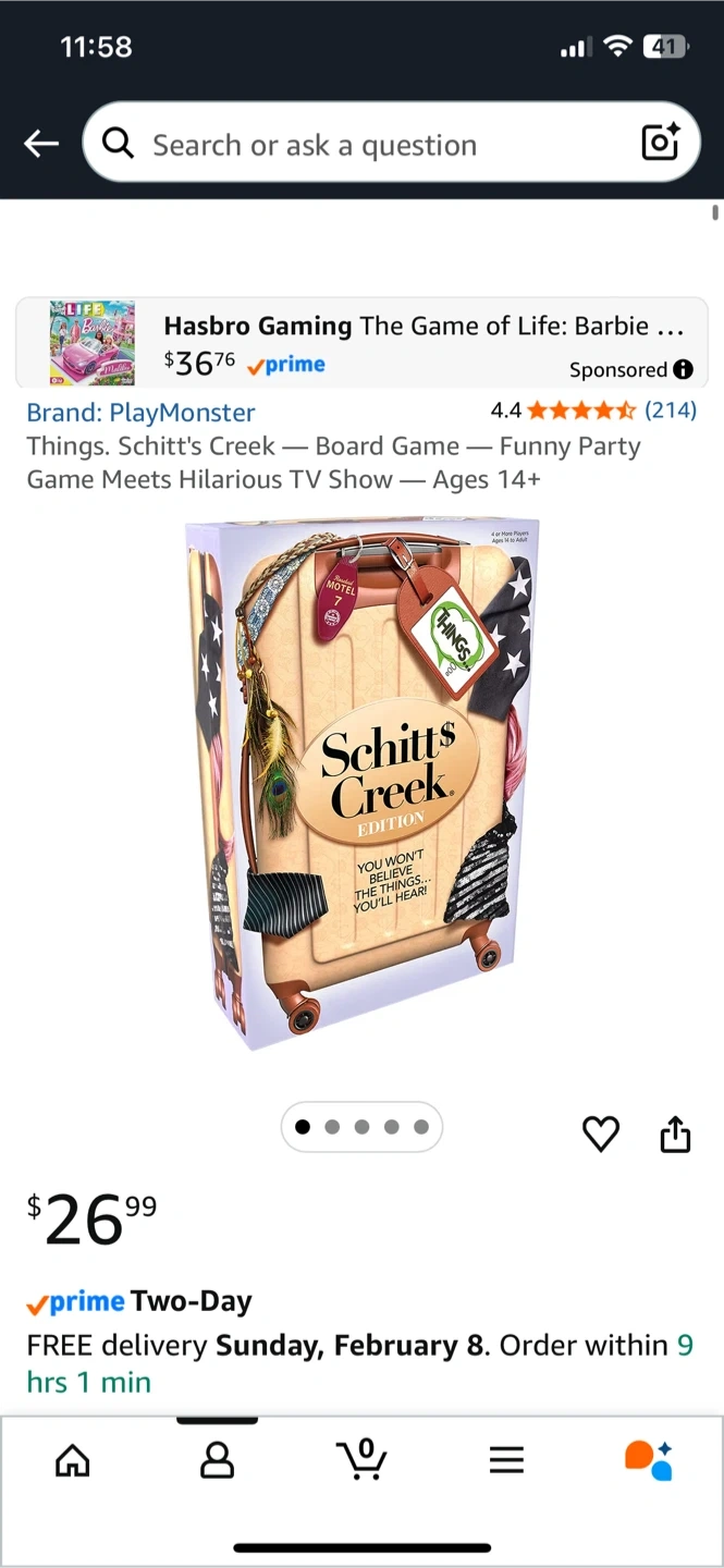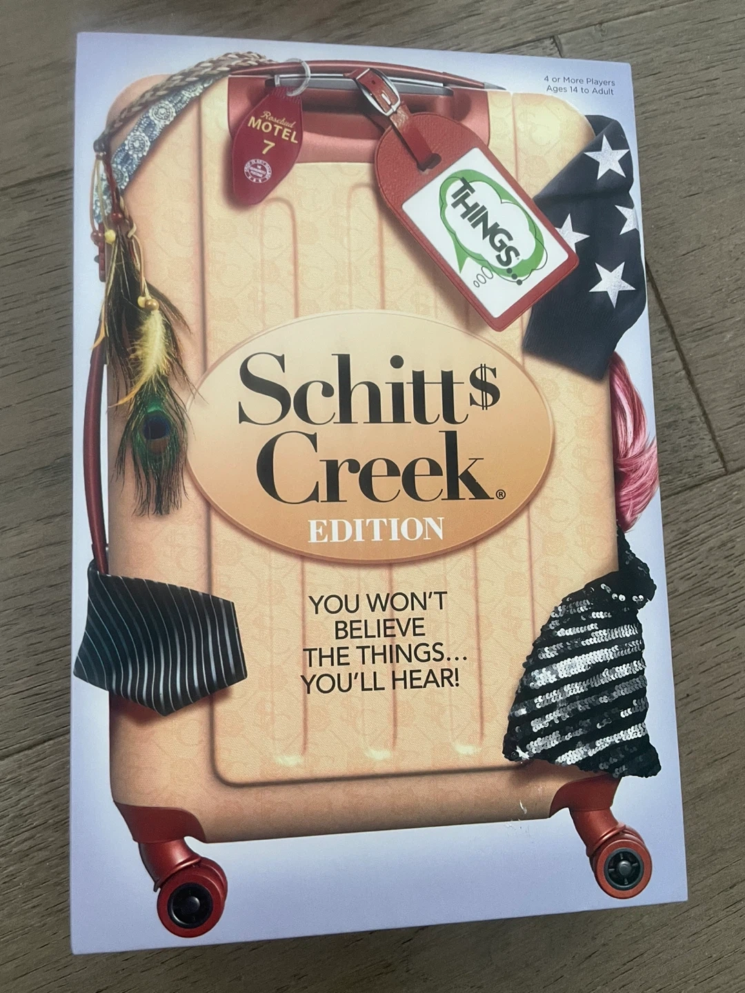 This is the "Things" board game, Schitt's Creek Edition. It includes 188 Topic Cards, Response Pad, Score Pad, Pencils, and a Sticker Sheet. It's for ages 14 to adult and 4 or more players.