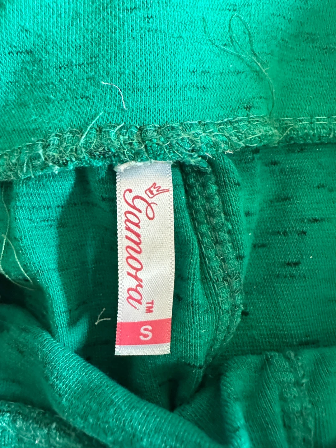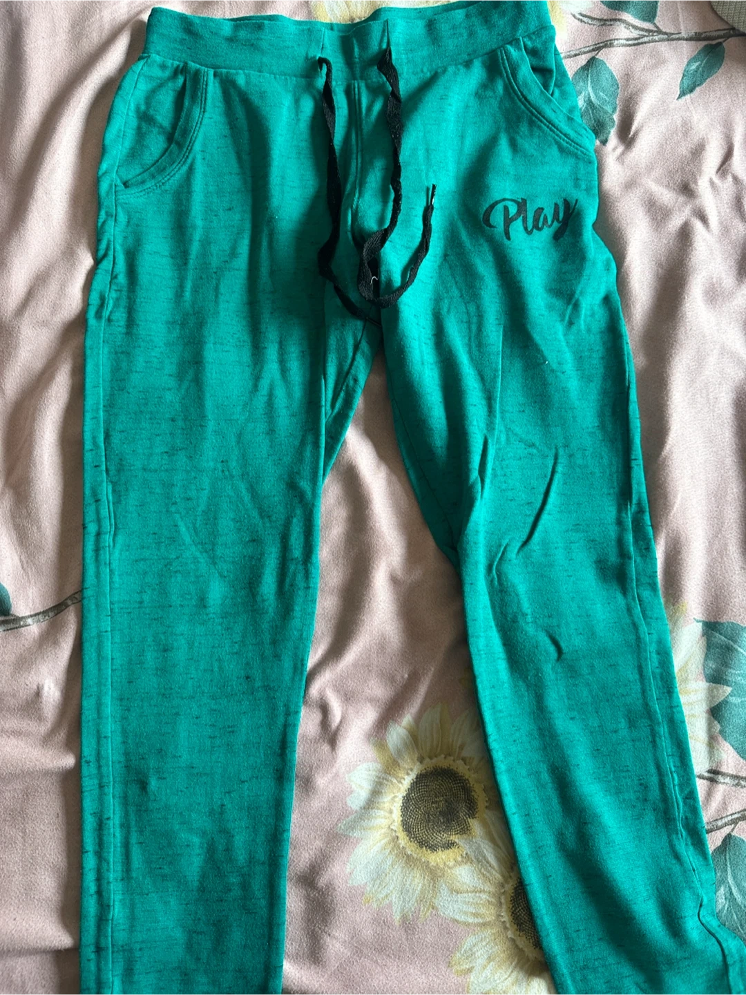 Selling green Yamora joggers in size small. They have a drawstring and the word 'Play' printed on the leg. Great for casual wear or lounging around the house!