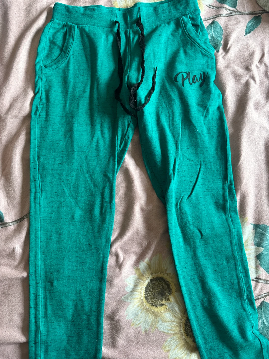Selling green Yamora joggers in size small. They have a drawstring and the word 'Play' printed on the leg. Great for casual wear or lounging around the house!