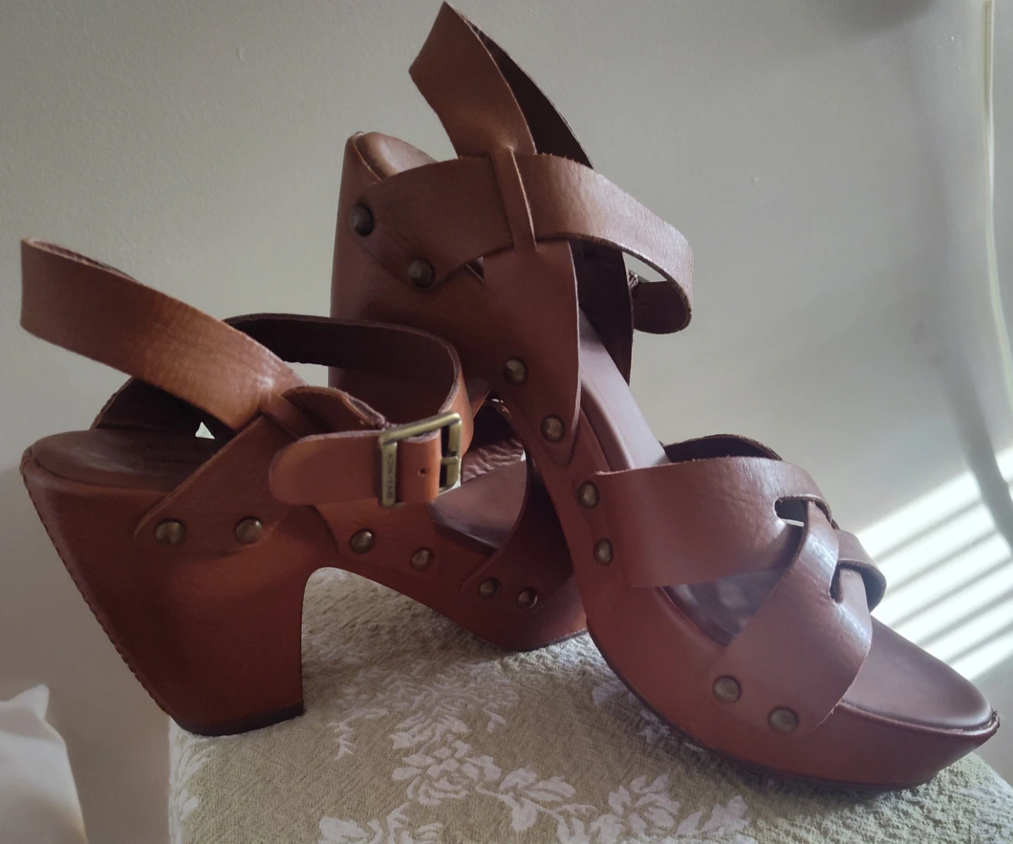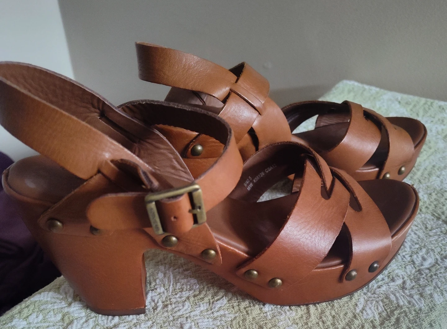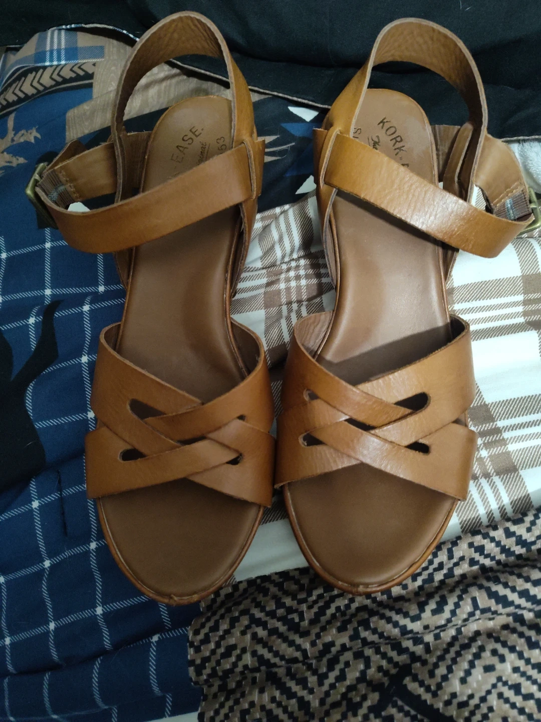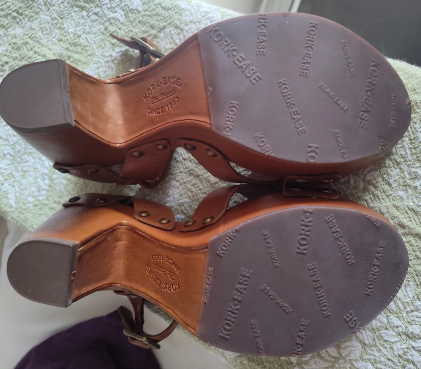 Excellent condition 4" wedge sandals has adjustable straps uppers are leather. Brand is Cork-Ease" small dog home. PU 216th & Lougheed Hwy or Thursday's Langley Centre 930-1230.