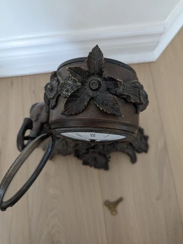 This Imperial Brevettato mantel clock is a true antique piece from Italy, made of bronze and featuring an intricately designed elephant figure. The clock is not a reproduction and still runs, making it a unique and functional addition to any collection. Crafted with exquisite attention to detail, this clock is a testament to the quality of Italian craftsmanship. Its bronze frame and finish add to its vintage charm, while its elephant design adds a touch of whimsy. A perfect decorative item for any mantel, desk or shelf, this clock is sure to impress.