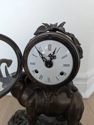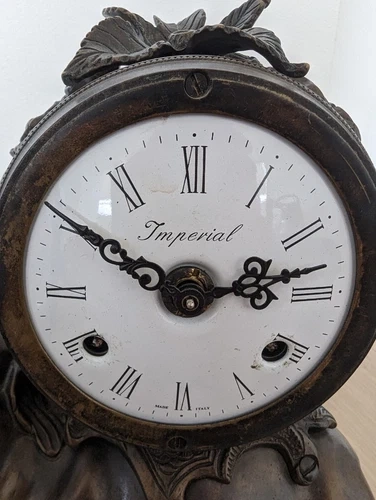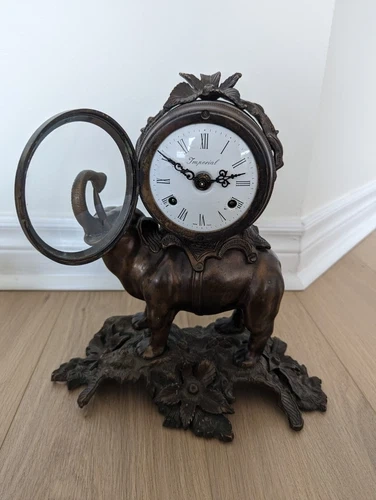 This Imperial Brevettato mantel clock is a true antique piece from Italy, made of bronze and featuring an intricately designed elephant figure. The clock is not a reproduction and still runs, making it a unique and functional addition to any collection. Crafted with exquisite attention to detail, this clock is a testament to the quality of Italian craftsmanship. Its bronze frame and finish add to its vintage charm, while its elephant design adds a touch of whimsy. A perfect decorative item for any mantel, desk or shelf, this clock is sure to impress.