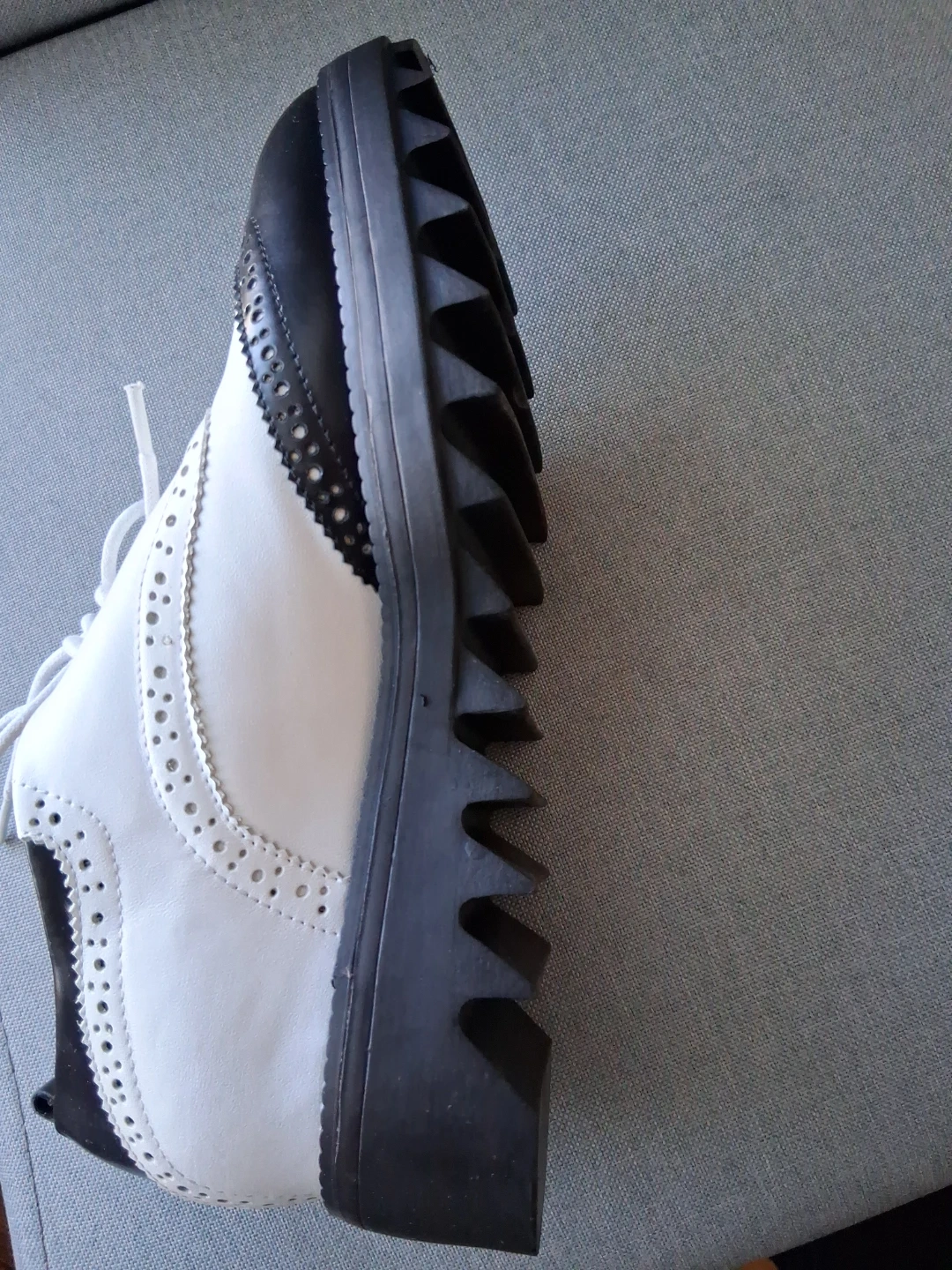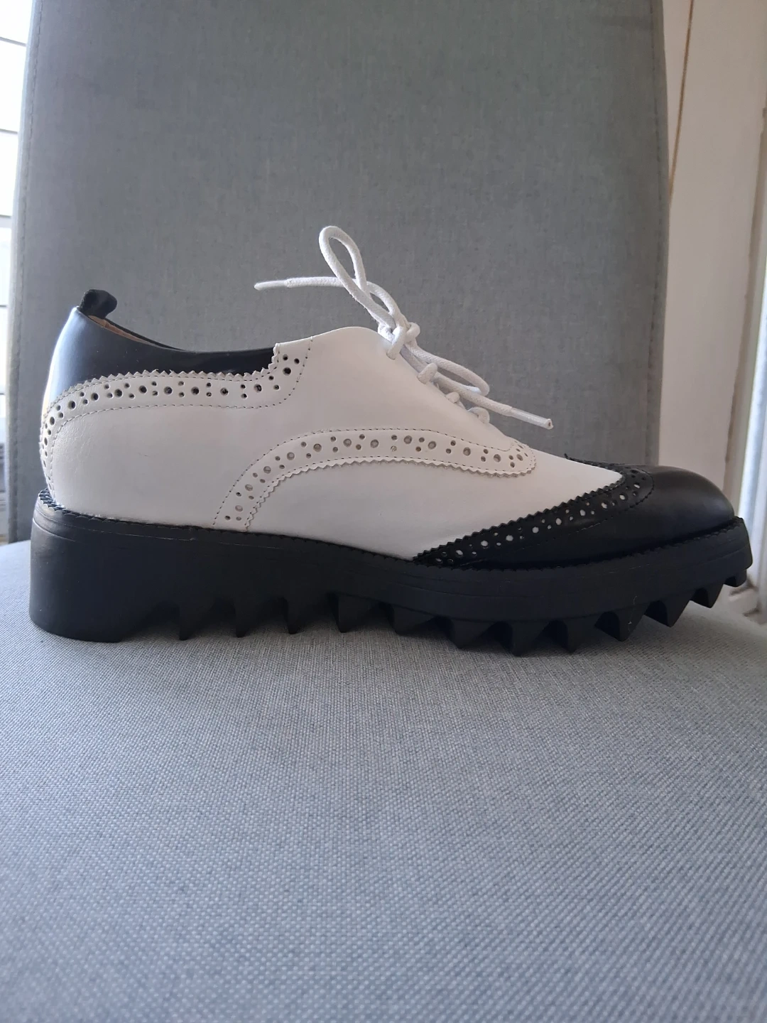 Chic black and white wingtip oxford shoes from Viade Ciclemens. These lace-up oxfords feature a classic brogue detailing and a sturdy lug sole. Leather upper and lining. Never worn. Too small. ๐๐