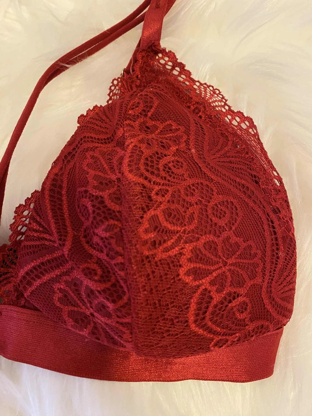 Selling a beautiful red lace bra. It's in great condition and has a delicate, intricate design. Perfect for adding a touch of elegance to your wardrobe!