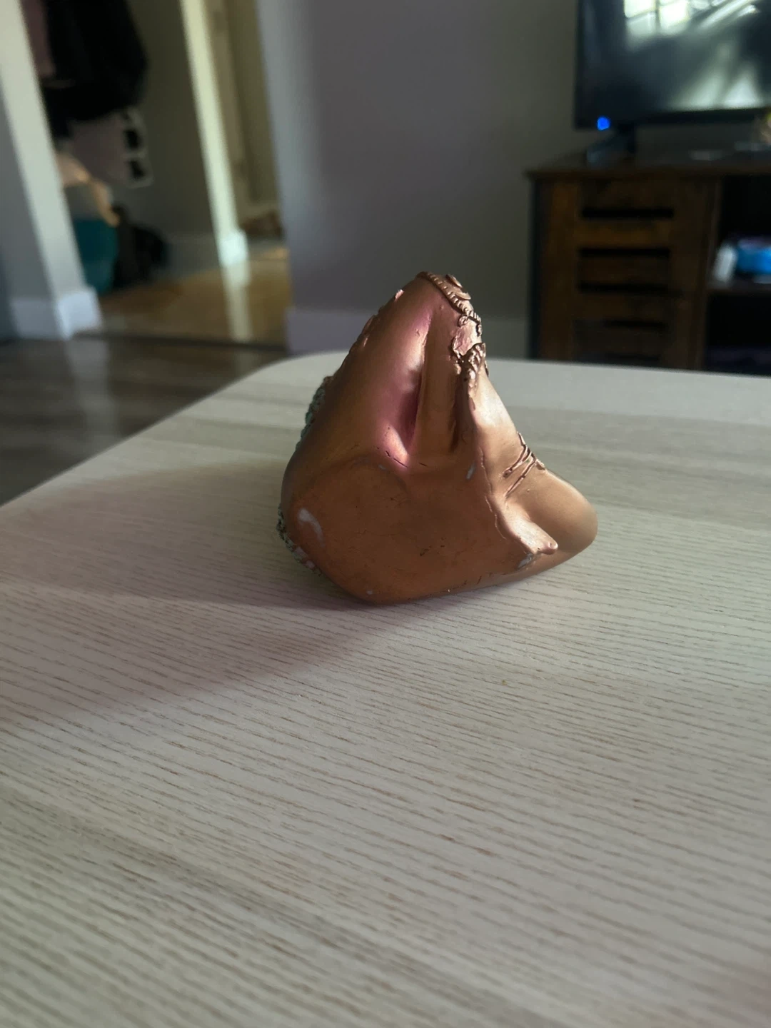 A decorative figurine depicting Mother Earth holding the planet as her pregnant belly. It has intricate details on her hair and body, with a metallic bronze and teal finish.