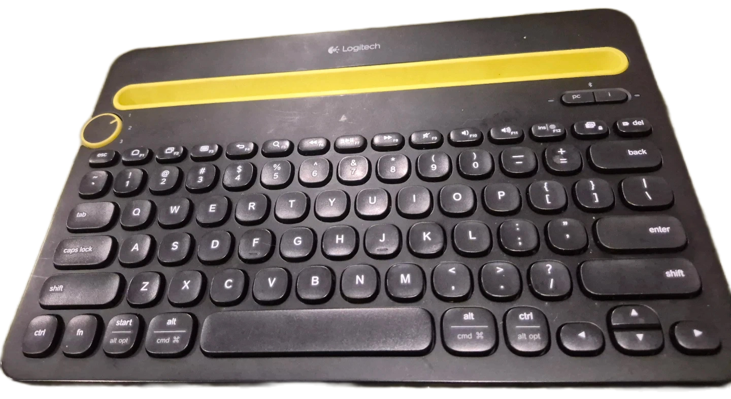 This is a black and yellow Logitech wireless keyboard. It's great for multitasking and has a convenient scroll wheel on the side. Ideal for desktop or tablet use!