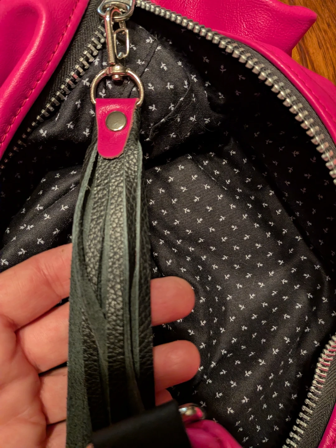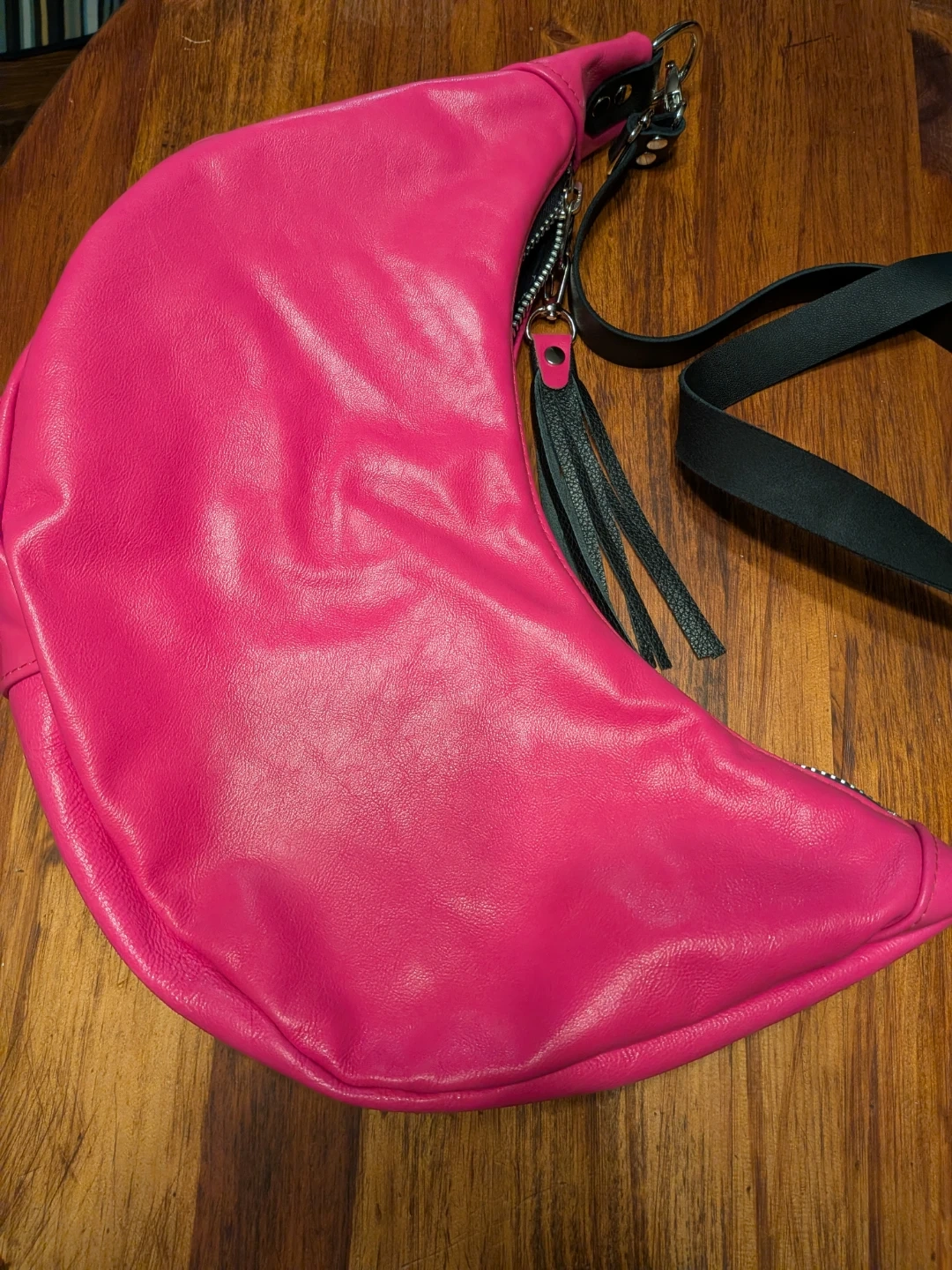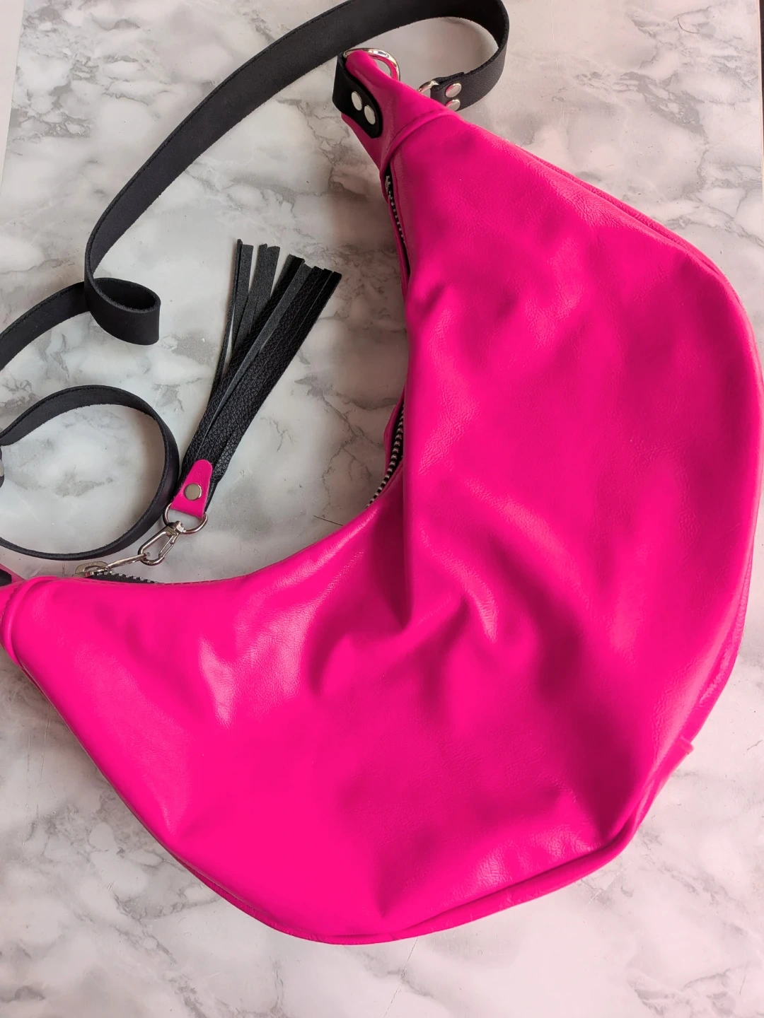 This local designer stylish shoulder bag features a vibrant hot pink colour and a unique crescent shape. It's crafted from faux leather and includes decorative black leather tassels for a touch of flair. The interior lining has a subtle pattern.
