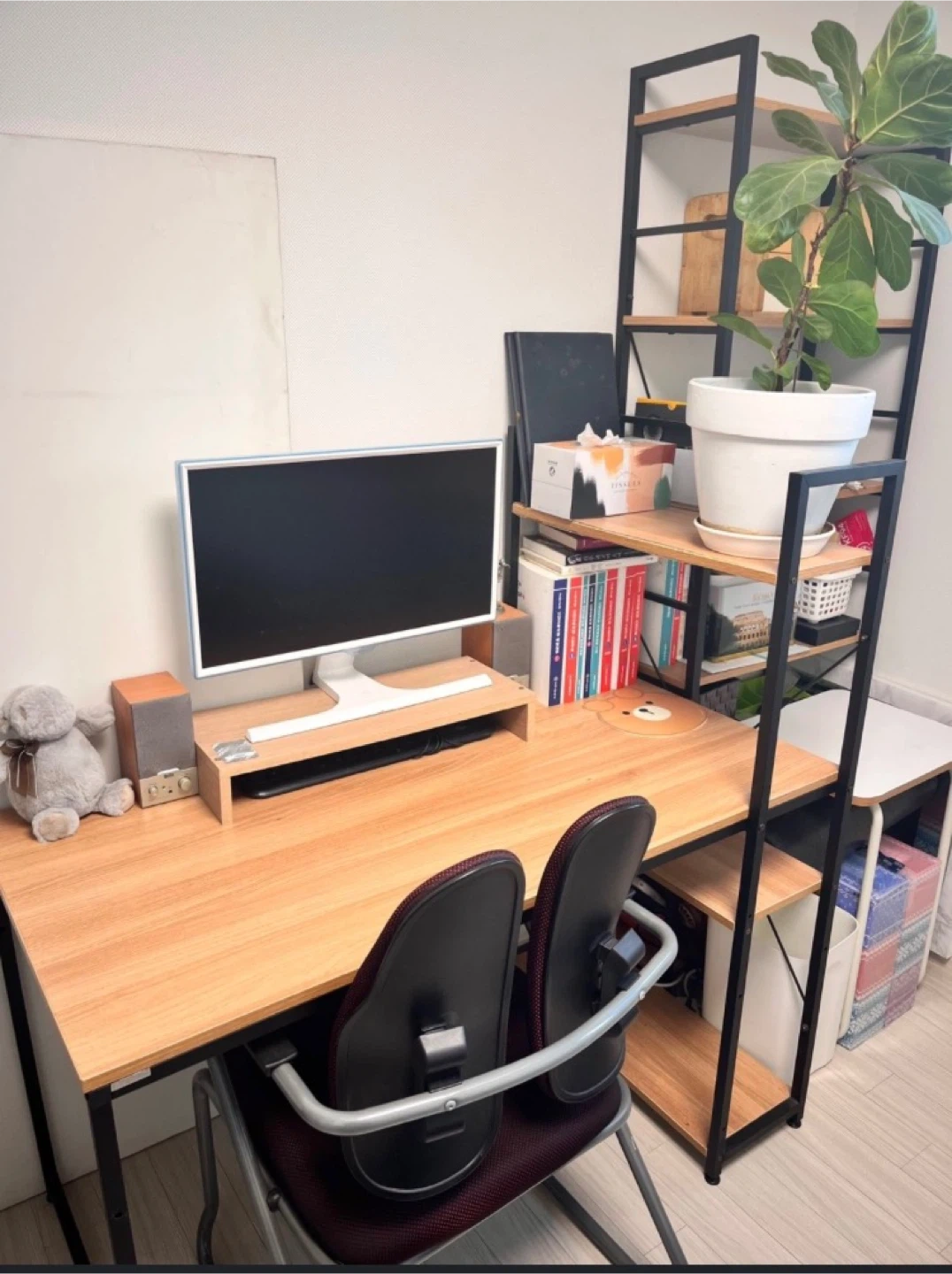 Selling a desk with an attached bookshelf. It's in great condition and perfect for a home office or study space. The bookshelf provides extra storage and display space for books and decor