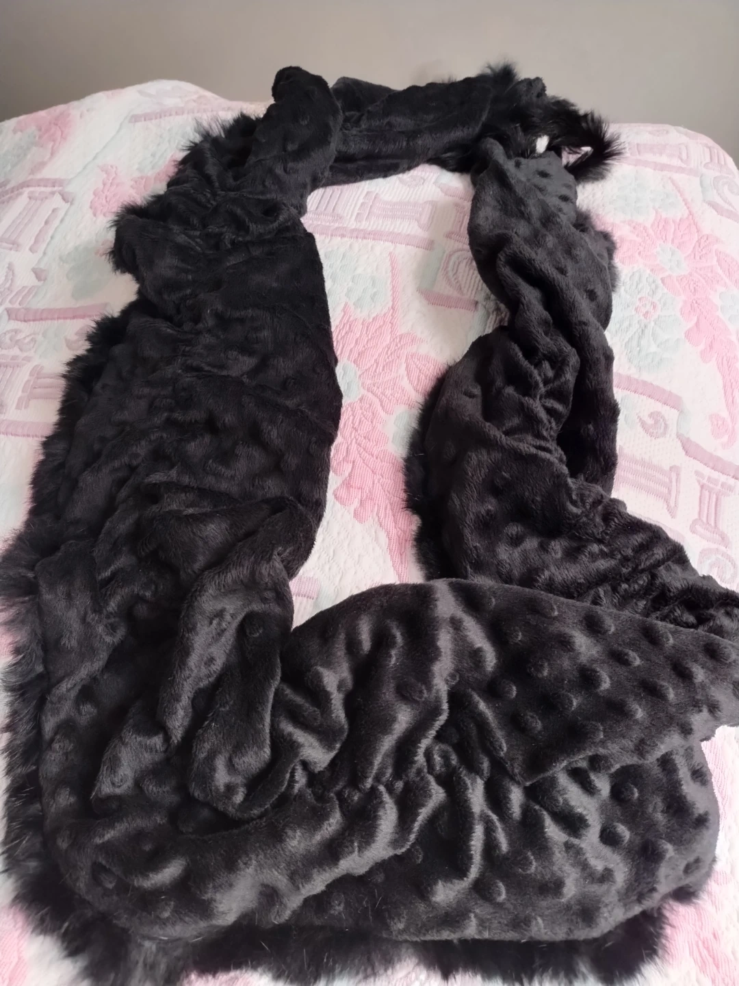 Cozy black scarf made from soft faux fur with a subtle embossed dot pattern. It has fuzzy trim along the edges. Great for adding warmth and style on a chilly day!