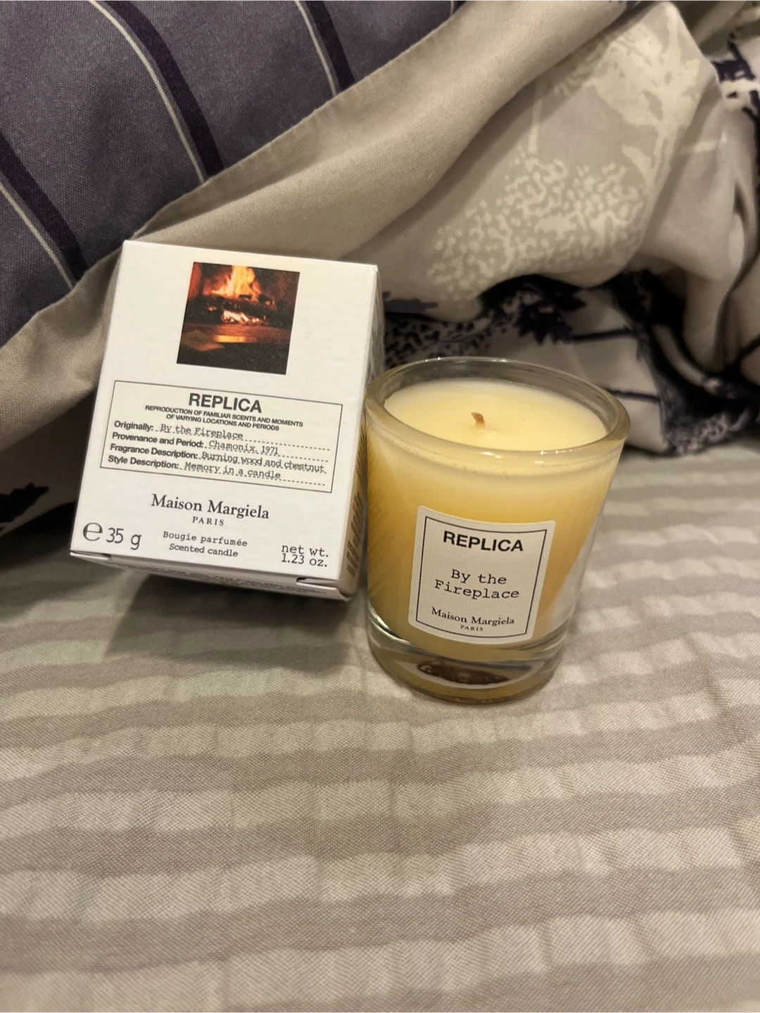 Maison Margiela REPLICA By the Fireplace scented candle. Fragrance description: burning wood and chestnut. Net wt. 1.23 oz (35 g).