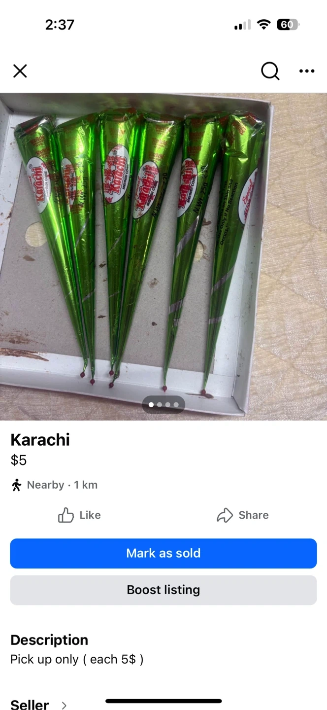 Buy & SellKarachi Mehndi Cones - Pack of 5Karachi Mehndi Cones - Pack of 5$5Karachi Mehndi cones for application. Each cone is 25g. Comes in a pack of 5. Great for temporary body art!BrandKarachiWHERE TO MEETWinston Churchill Blvd MississaugaView MapSELLERSkyChurchill Meadows15111 reviews0 chats·0 favorites·20 viewsSEND CHAT TO SELLERHi Sky! I’m interested in your listing.Hi Sky! I’m interested in your listing.Get the Karrot app to chatSign In to chat